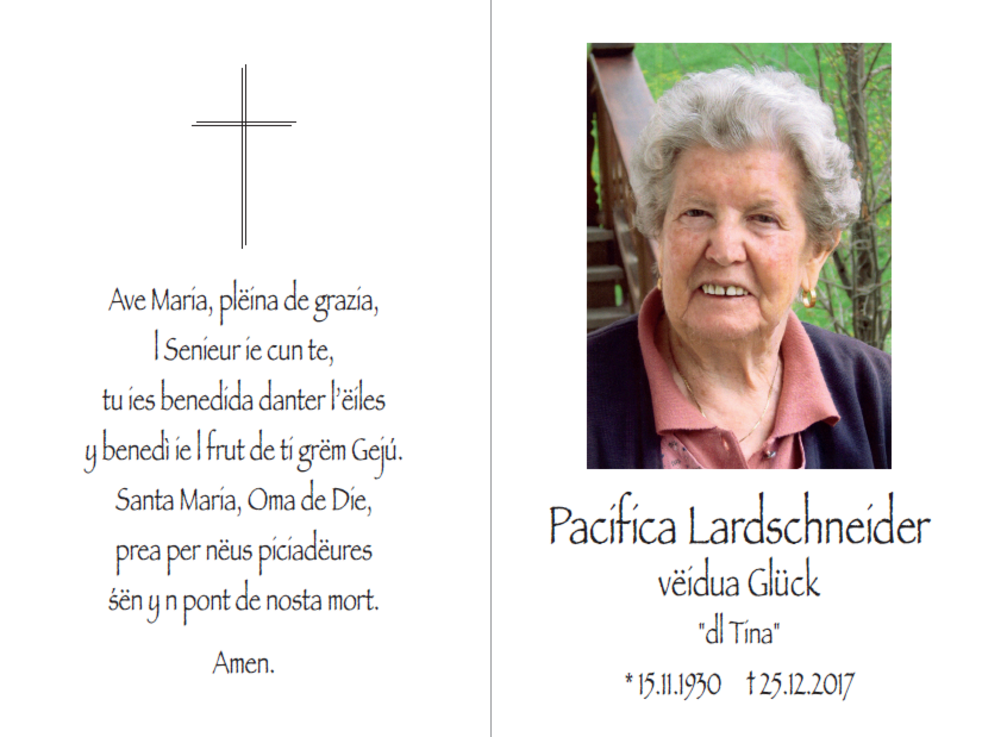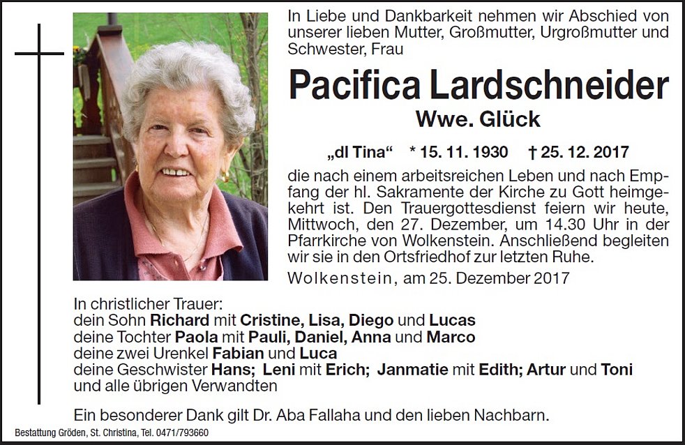 Den Trauergottesdienst feiern wir am Mittwoch, dem 27. Dezember, um 14.30 Uhr in der Pfarrkirche von Wolkenstein. Anschließend begleiten wir sie in den Ortsfriedhof zur letzten Ruhe.