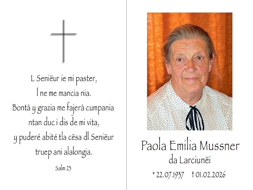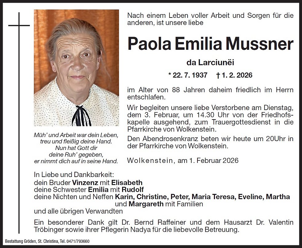 Wir begleiten unsere liebe Verstorbene am Dienstag, dem 3. Februar, um 14.30 Uhr von der Friedhofskapelle ausgehend, zum Trauergottesdienst in die Pfarrkirche von Wolkenstein.