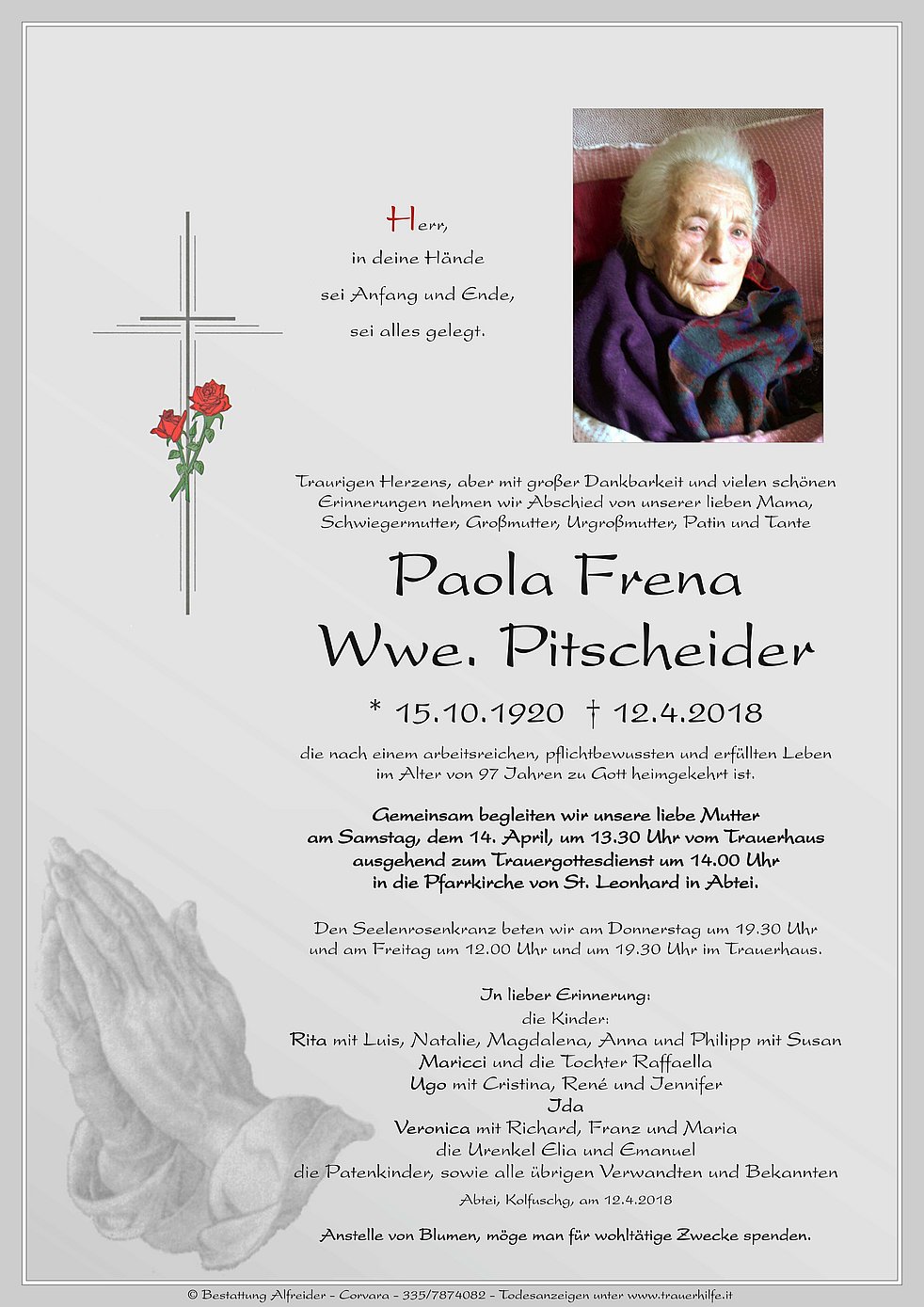 Gemeinsam begleiten wir unsere liebe Mutter am Samstag, dem 14. April, um 13.30 Uhr vom Trauerhaus ausgehend zum Trauergottesdienst um 14.00 Uhr in die Pfarrkirche von St. Leonhard in Abtei.