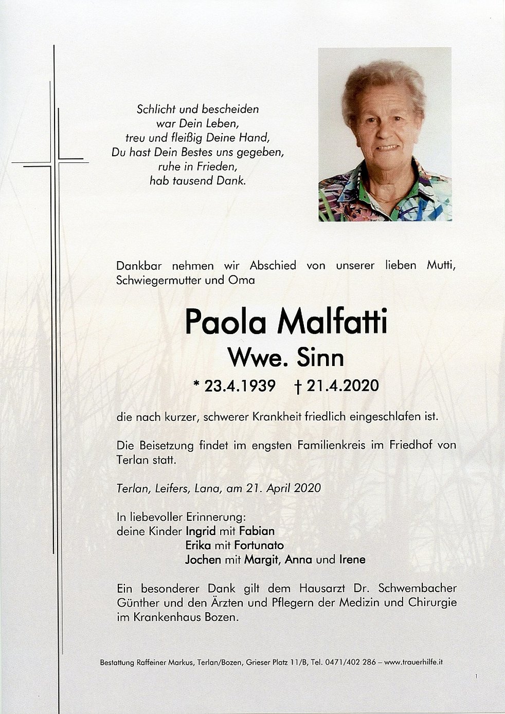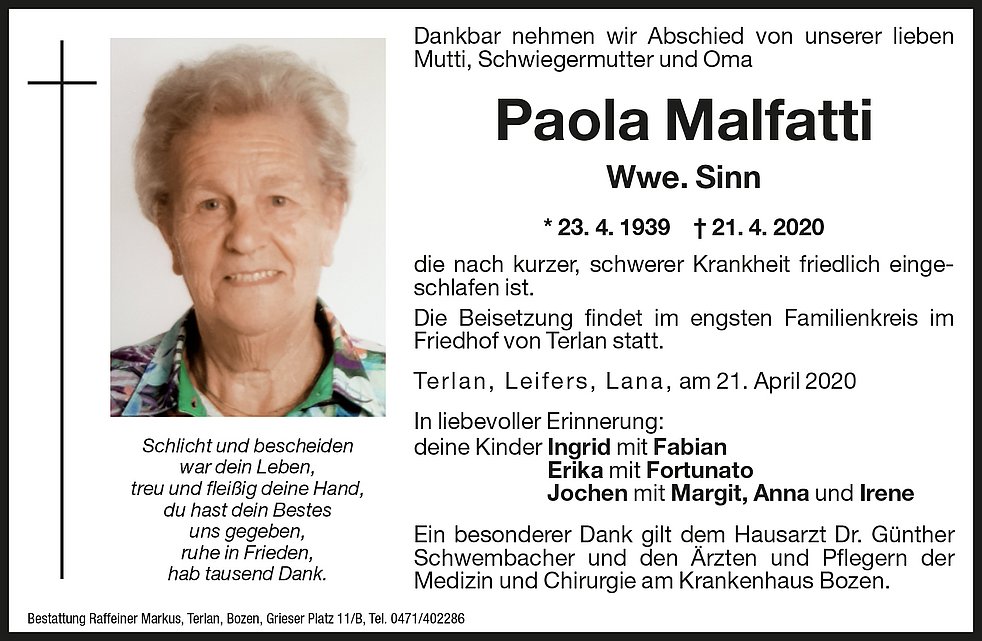 Die Beisetzung findet im engsten Familienkreis im Friedhof von Terlan statt.