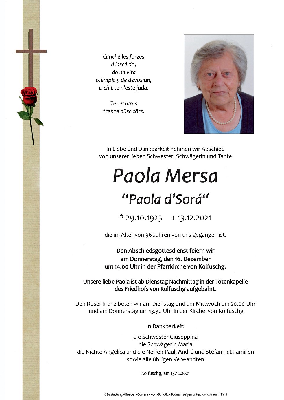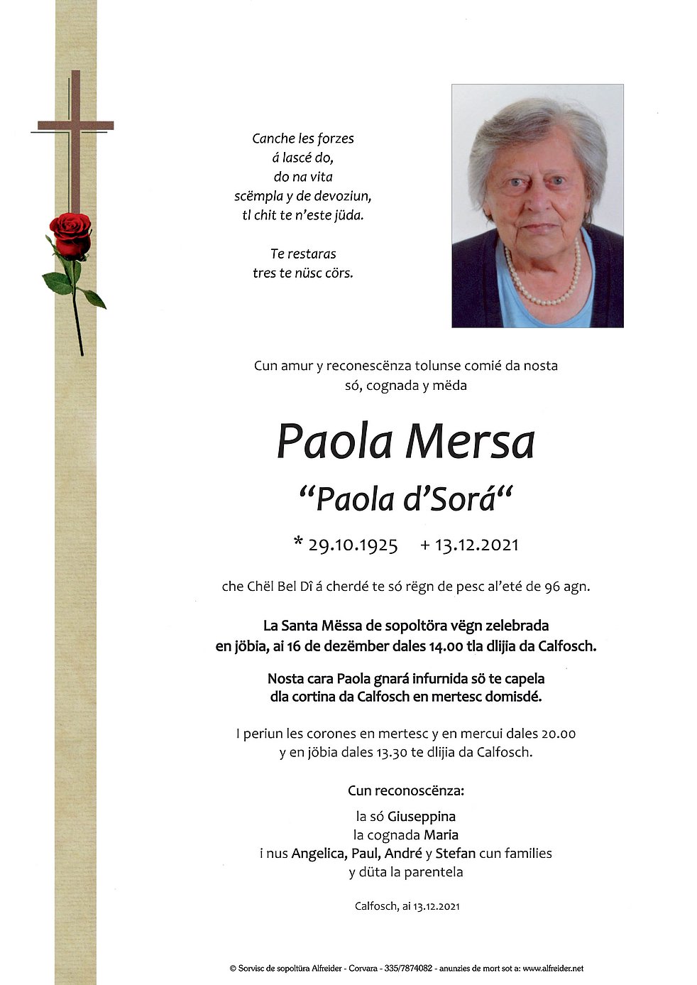Unsere liebe Paola ist ab Dienstag Nachmittag in der Totenkapelle des Friedhofs von Kolfuschg aufgebahrt.