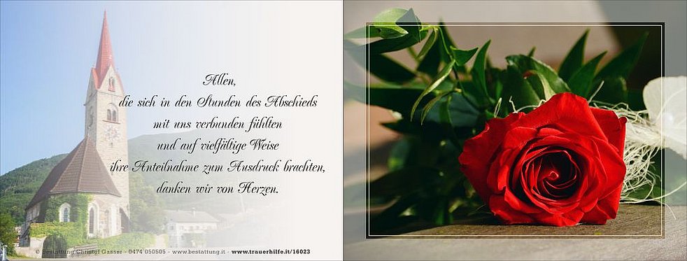 Ein besonderer Dank gilt dem Hausarzt Dr. Letterio Taormina, den Sprengelschwestern, allen vom Hauspflegedienst, dem Team der Abteilung Chirurgie und Medizin am Krankenhaus Bruneck sowie dem gesamten Personal vom 2. Wohnbereich des Wohn- und Pflegeheimes Olang für die liebevolle Begleitung.