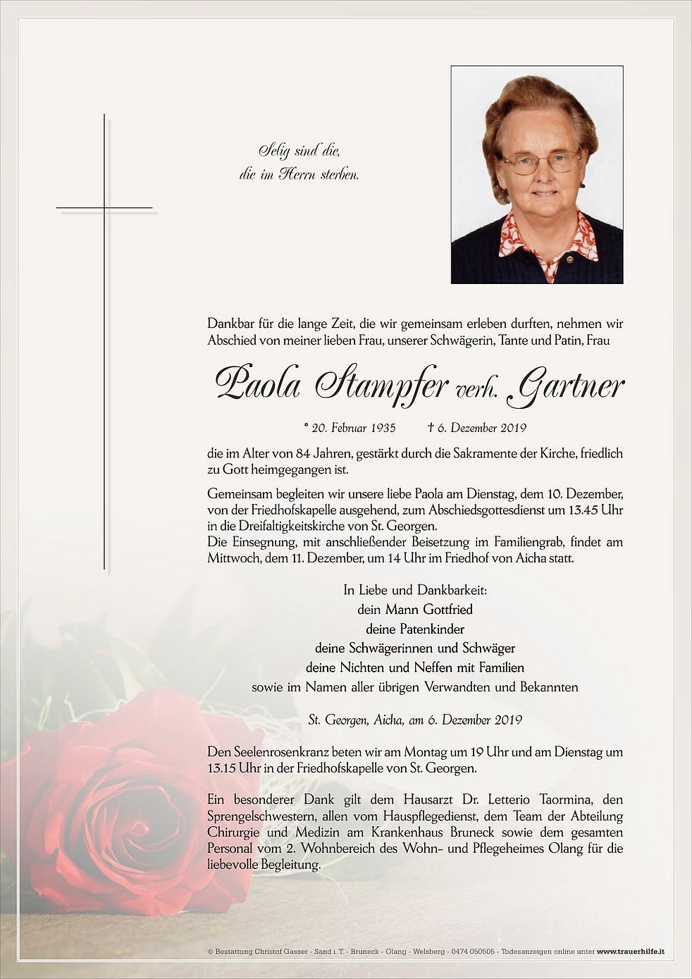 Gemeinsam begleiten wir unsere liebe Paola am Dienstag, dem 10. Dezember, von der Friedhofskapelle ausgehend, zum Abschiedsgottesdienst um 13.45 Uhr in die Dreifaltigkeitskirche von St. Georgen.