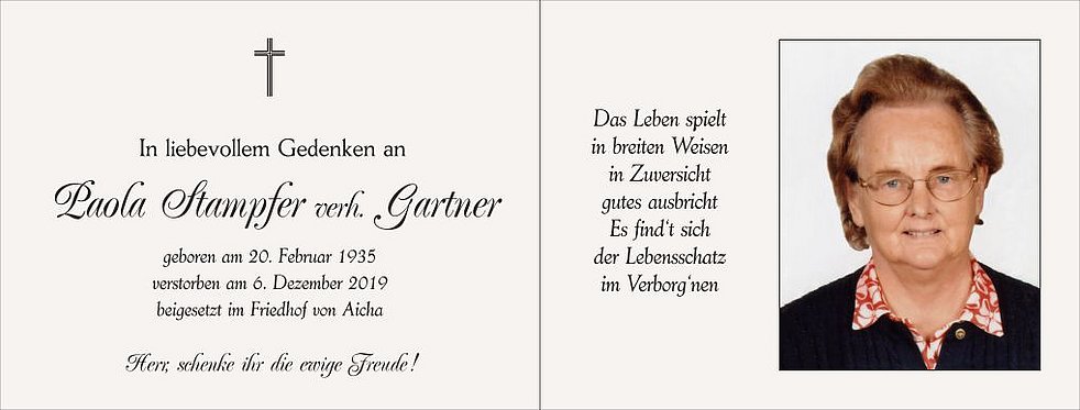 Die Einsegnung, mit anschließender Beisetzung im Familiengrab, findet am Mittwoch, dem 11. Dezember, um 14 Uhr im Friedhof von Aicha statt.