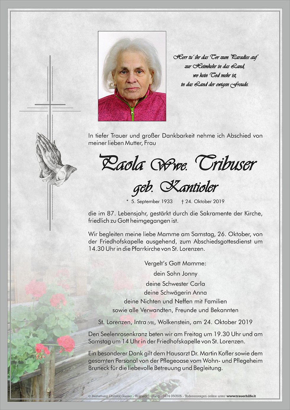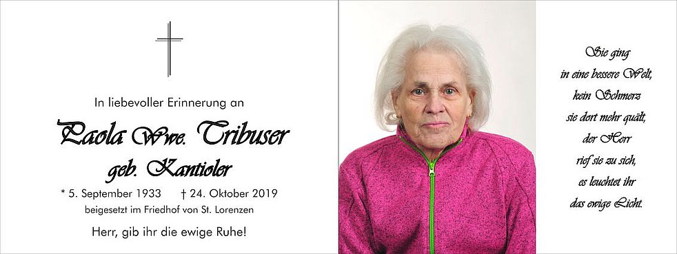 Wir begleiten meine liebe Mamme am Samstag, 26. Oktober, von der Friedhofskapelle ausgehend, zum Abschiedsgottesdienst um 14.30 Uhr in die Pfarrkirche von St. Lorenzen.