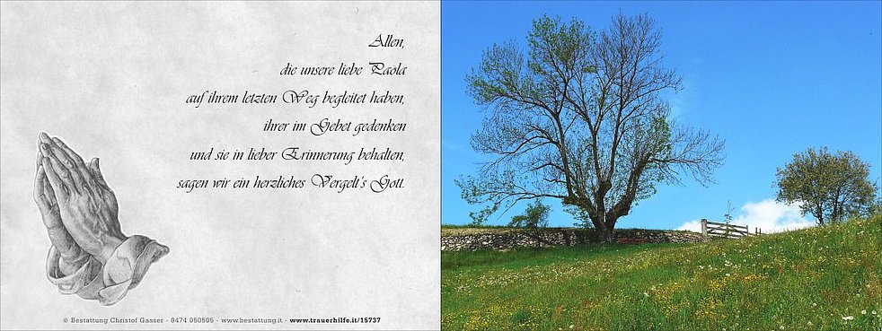 Ein besonderer Dank gilt dem Hausarzt Dr. Martin Kofler sowie dem gesamten Personal von der Pflegeoase vom Wohn- und Pflegeheim Bruneck für die liebevolle Betreuung und Begleitung.