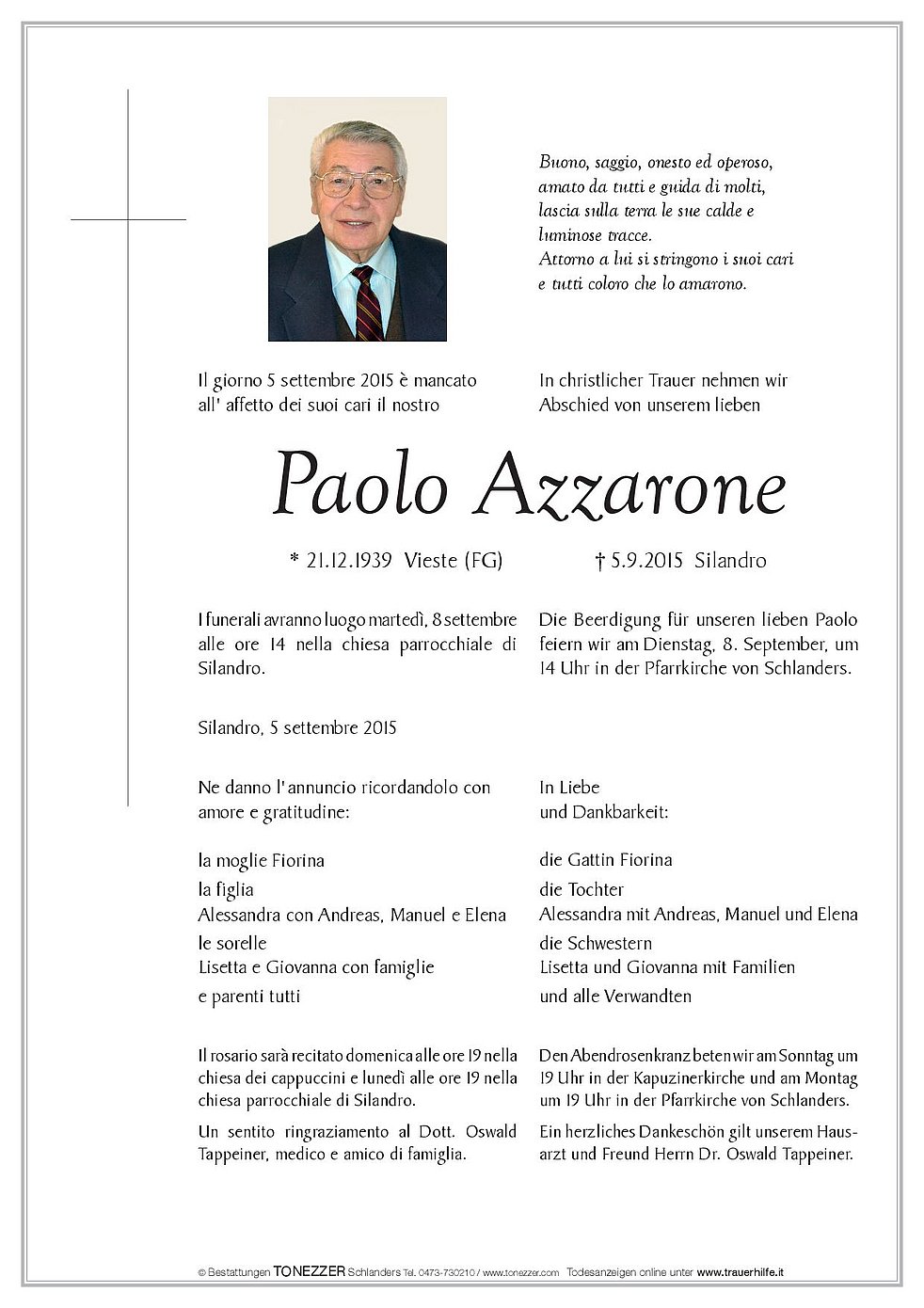 * 21.12.1939 Vieste (FG) † 5.9.2015 Silandro
