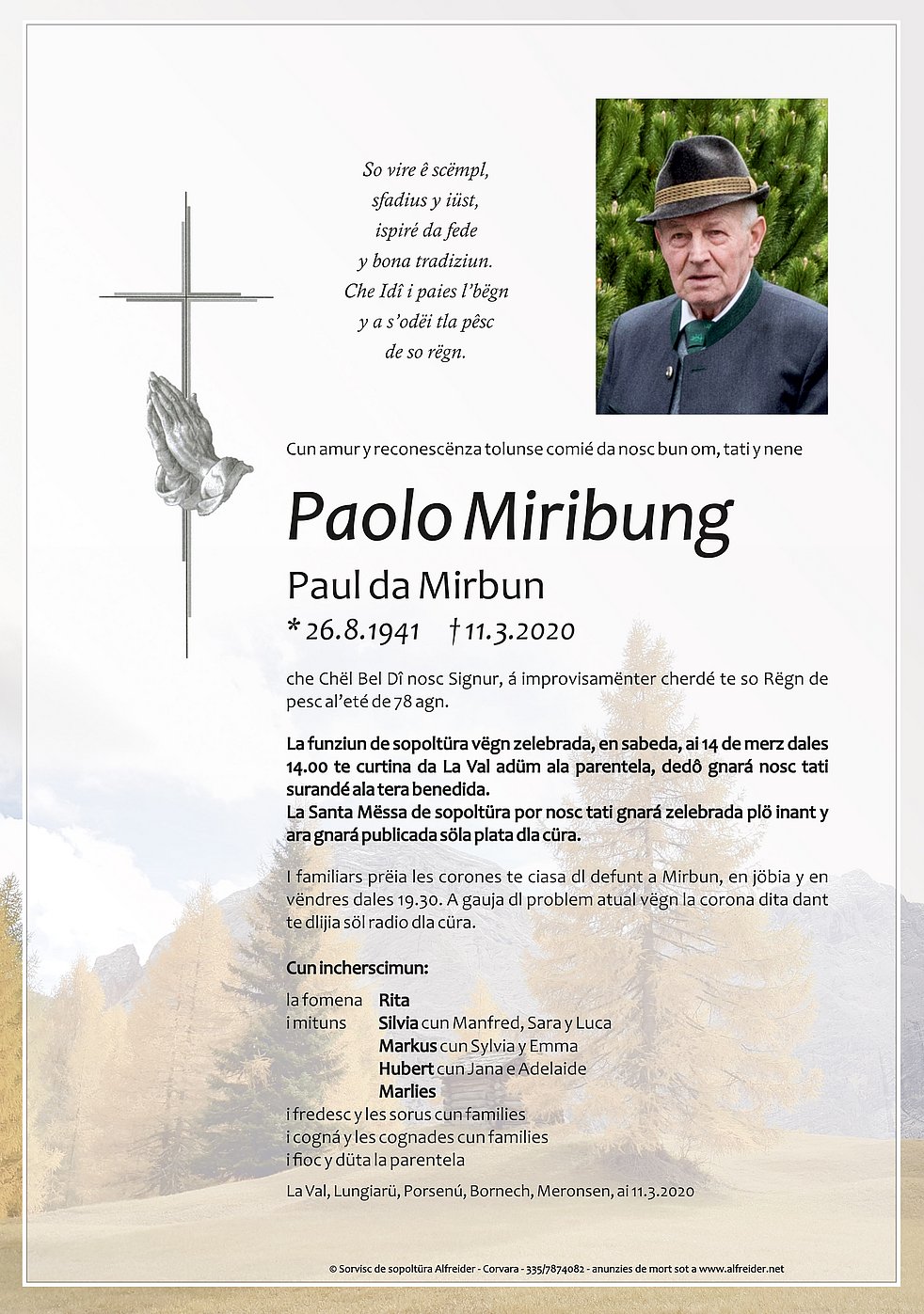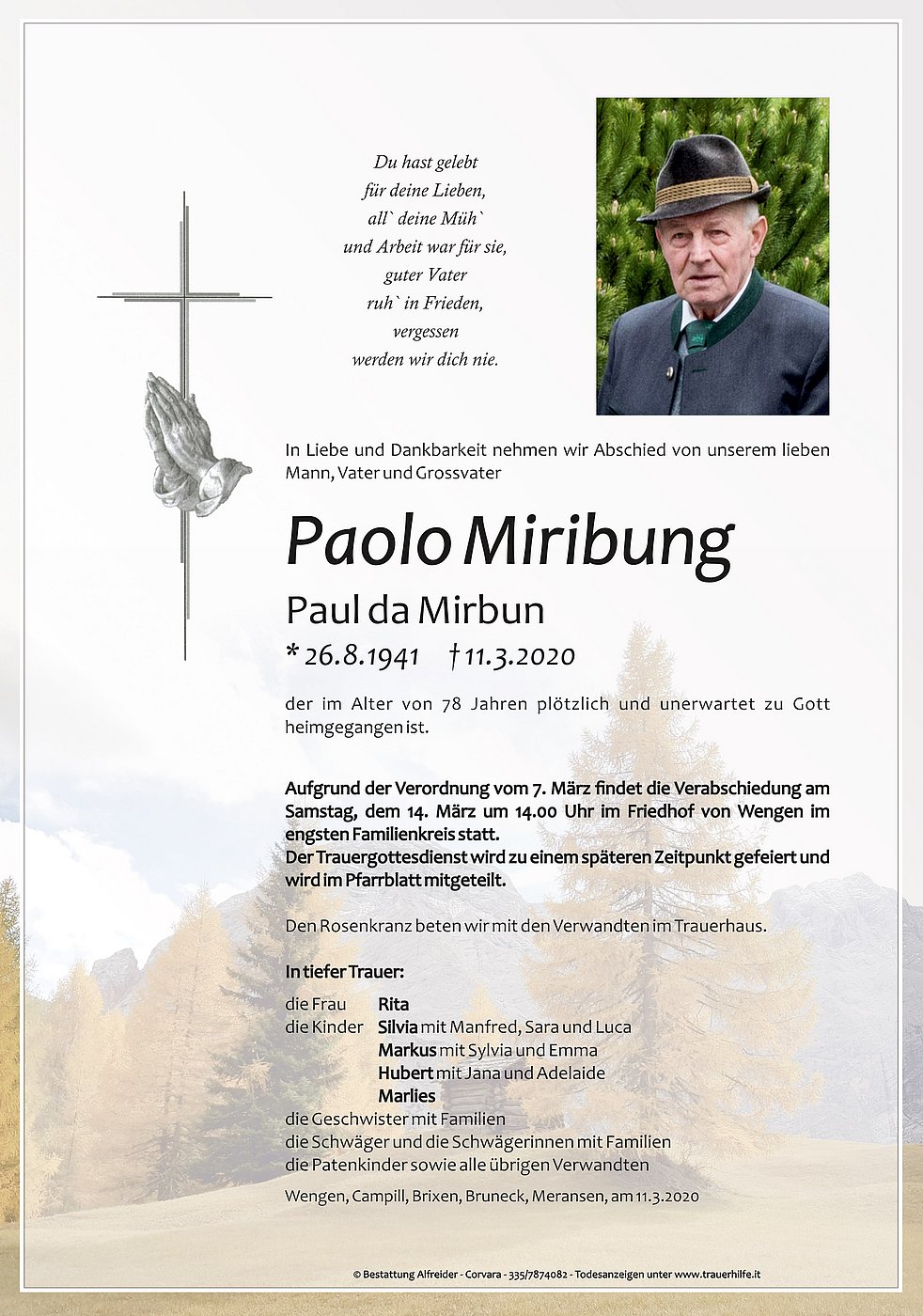 Aufgrund der Verordnung vom 7. März findet die Verabschiedung am Samstag, dem 14. März um 14.00 Uhr im Friedhof von Wengen im engsten Familienkreis statt.