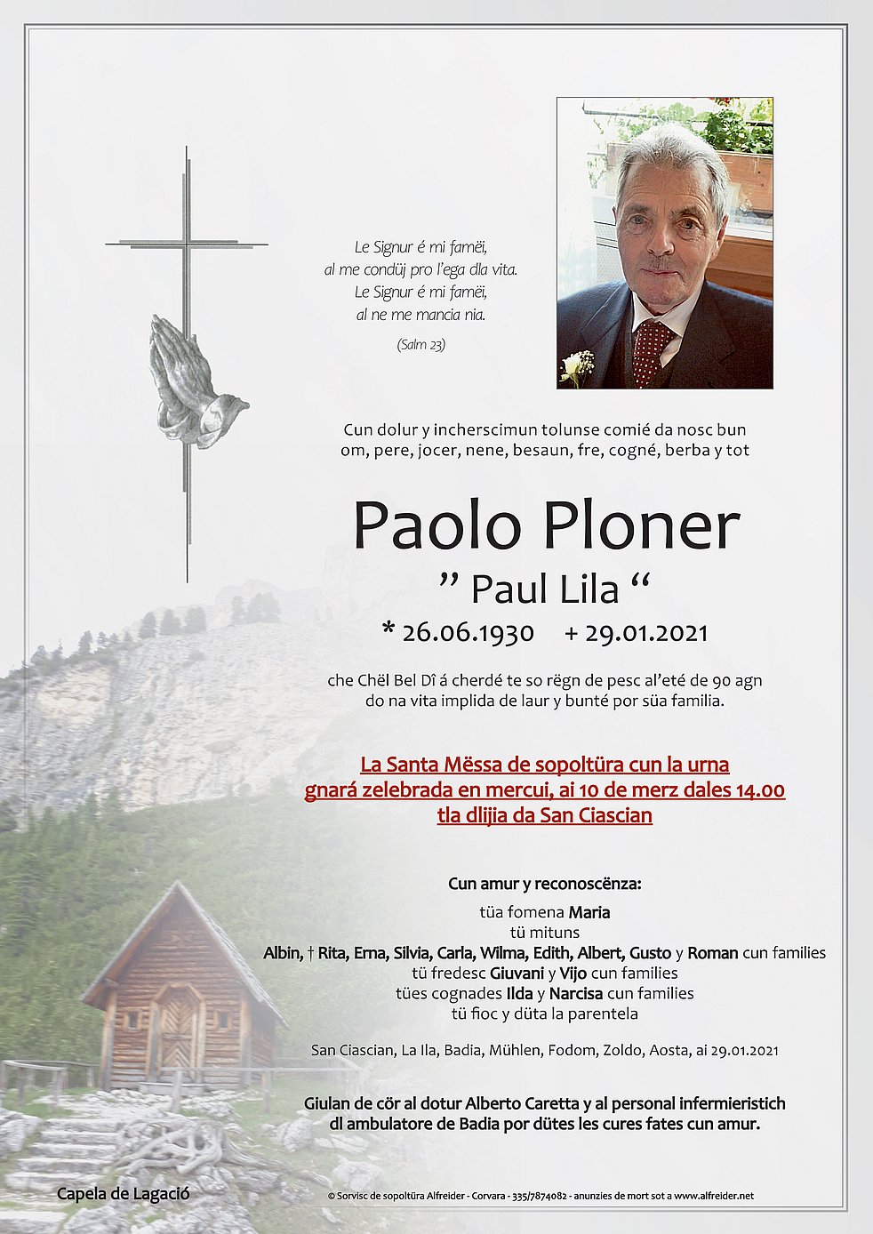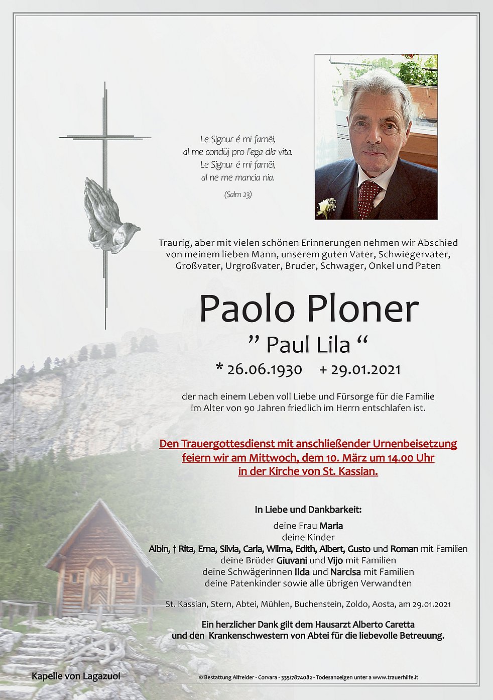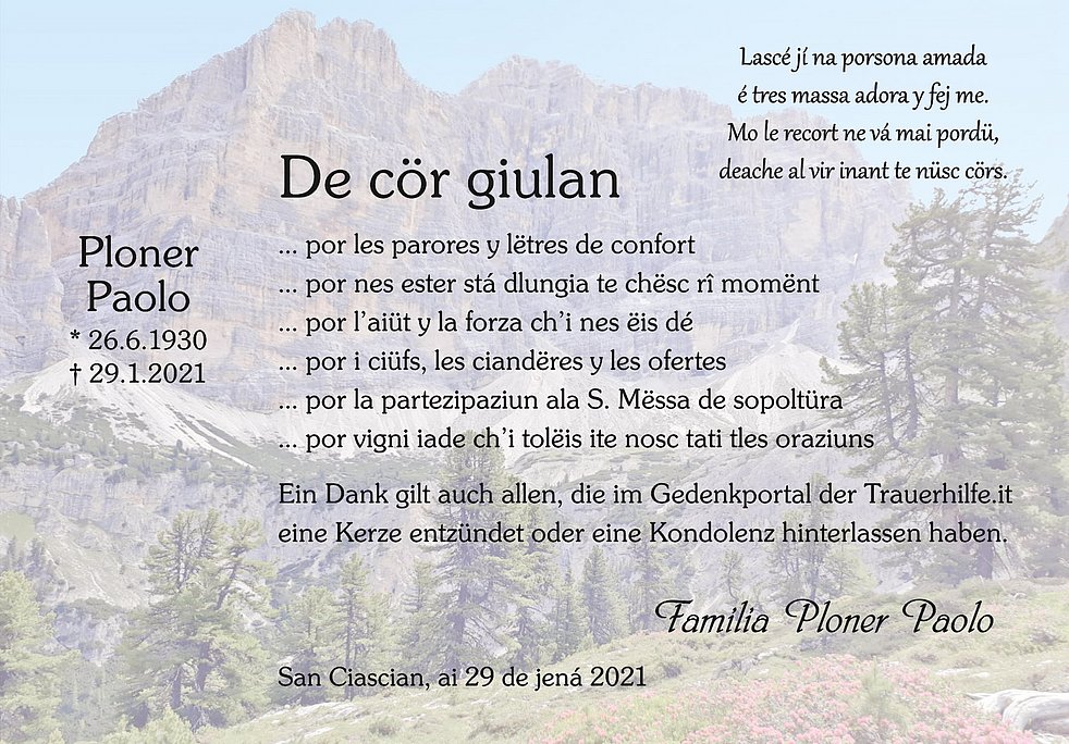Ein herzlicher Dank gilt dem Hausarzt Alberto Caretta und den Krankenschwestern von Abtei für die liebevolle Betreuung.