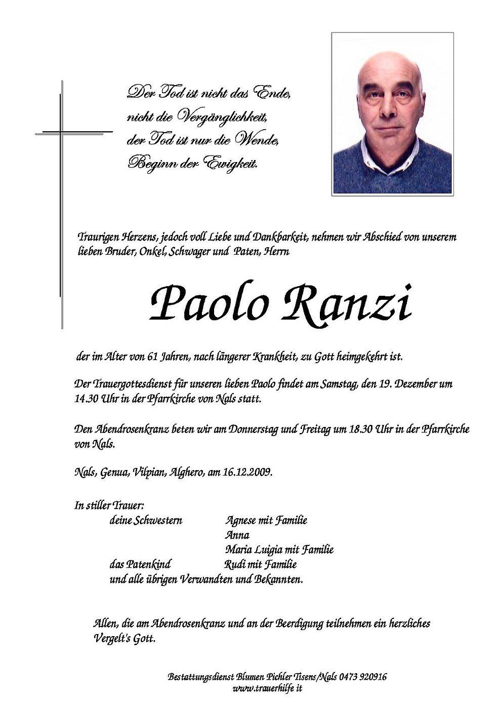 Der Trauergottesdienst für unseren lieben Paolo findet am Samstag, den 19. Dezember um