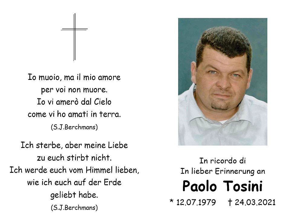 La Santa Messa in suffragio sarà celebrata lunedì 29 marzo alle ore 14.30 nella chiesa Parrocchiale di Mezzaselva con successiva sepoltura nel cimitero.
