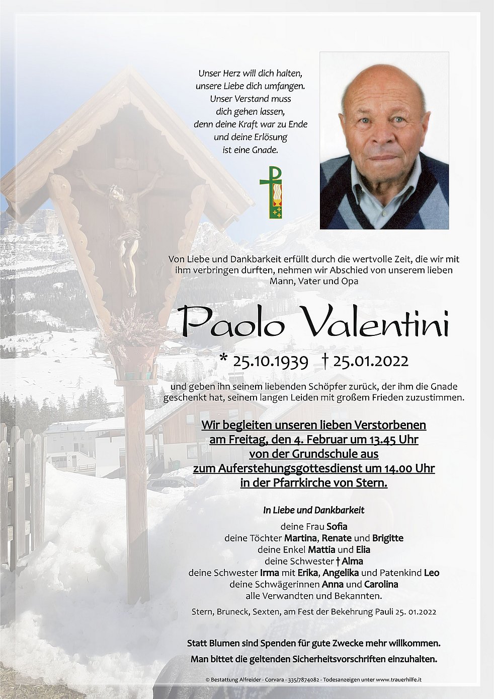 Wir begleiten unseren lieben Verstorbenen am Freitag, den 4. Februar um 13.45 Uhr von der Grundschule aus zum Auferstehungsgottesdienst um 14.00 Uhr in der Pfarrkirche von Stern.