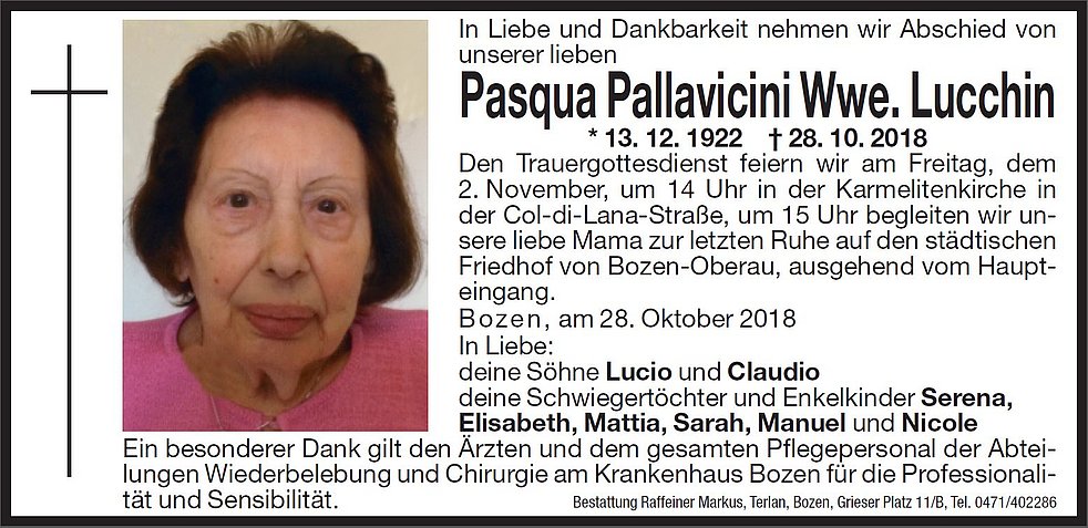 Den Trauergottesdienst feiern wir am Freitag, dem 2. November, um 14 Uhr in der Karmeliten Kirche in der Col di Lana Straße, um 15 Uhr begleiten wir unsere liebe Mama zur letzten Ruhe auf den städtischen Friedhof von Bozen-Oberau, ausgehend vom Haupteingang.