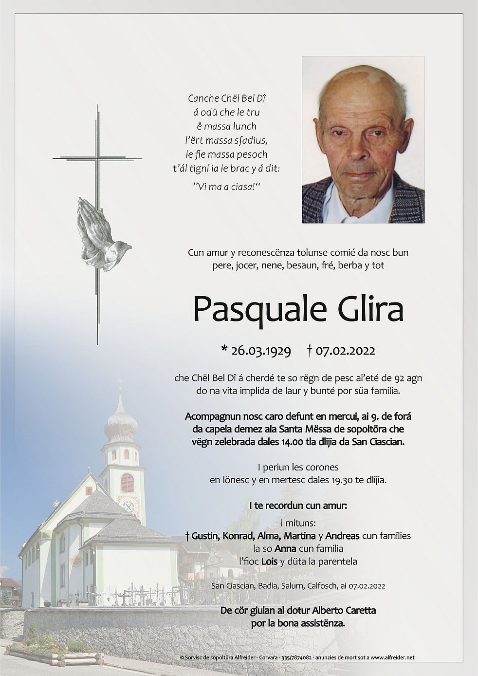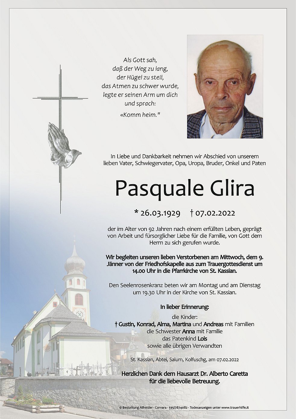 Wir begleiten unseren lieben Verstorbenen am Mittwoch, dem 9. Jänner von der Friedhofskapelle aus zum Trauergottesdienst um 14.00 Uhr in die Pfarrkirche von St. Kassian.
