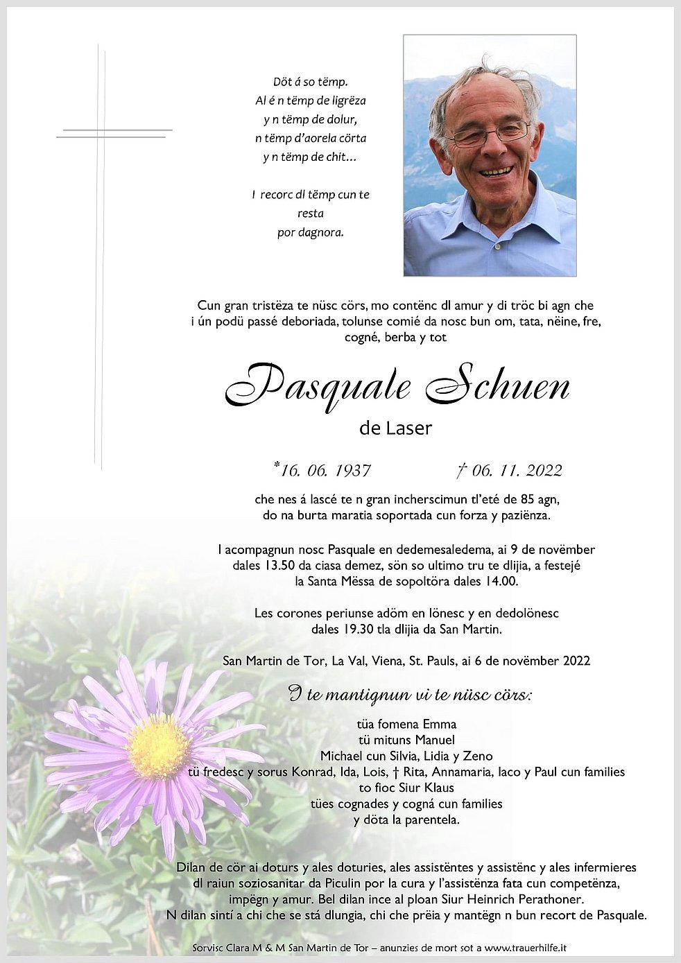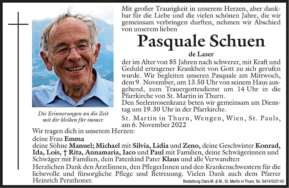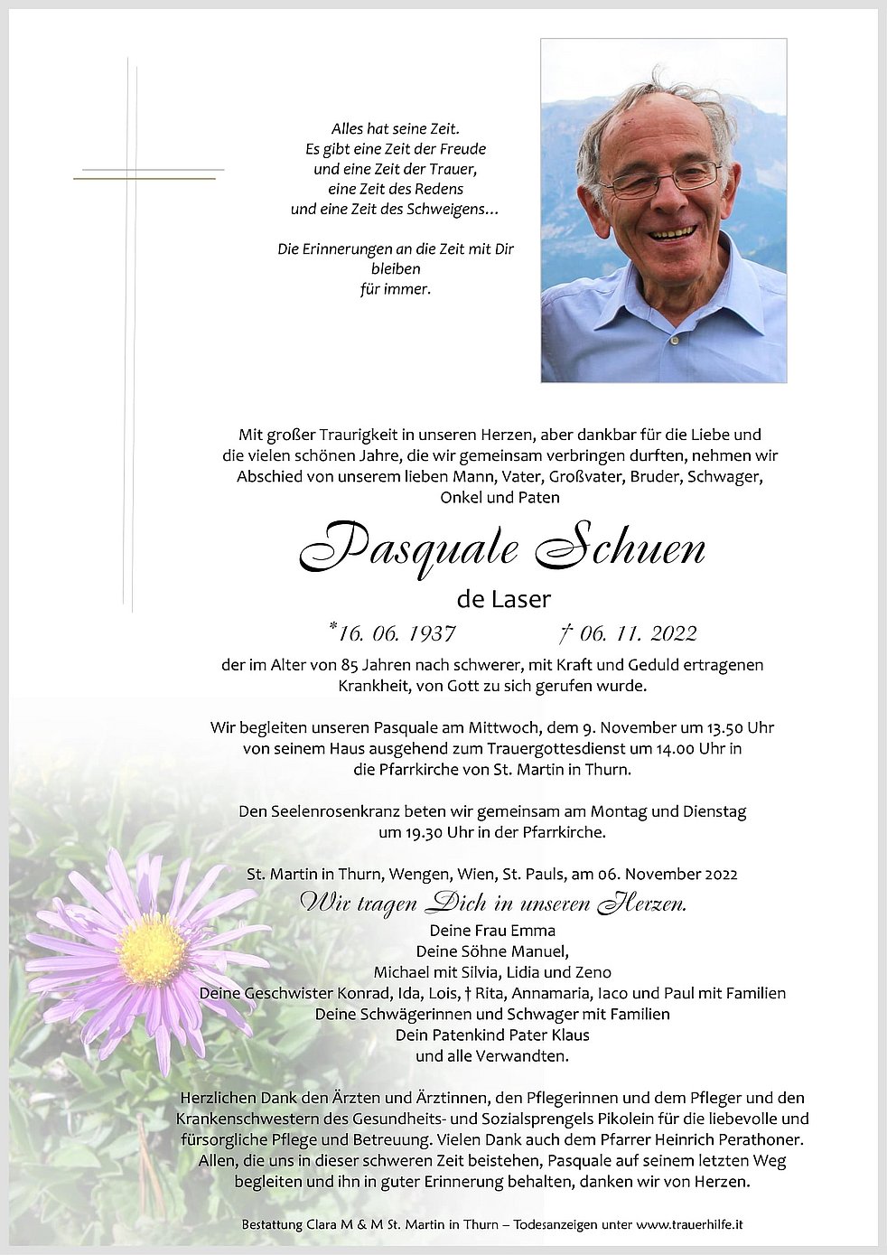 Wir begleiten unseren Pasquale am Mittwoch, dem 9. November um 13.50 Uhr von seinem Haus ausgehend zum Trauergottesdienst um 14.00 Uhr in die Pfarrkirche von St. Martin in Thurn.