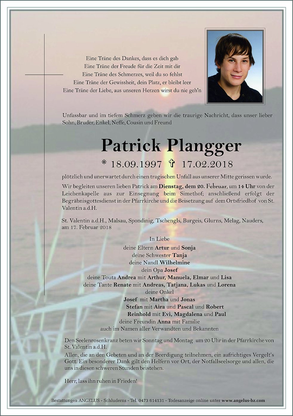 Wir begleiten unseren lieben Patrick am Dienstag, dem 20. Februar, um 14 Uhr von der Leichenkapelle aus zur Einsegnung beim Simethof; anschließend erfolgt der Begräbnisgottesdienst in der Pfarrkirche und die Beisetzung auf dem Ortsfriedhof von St. Valentin a.d.H.