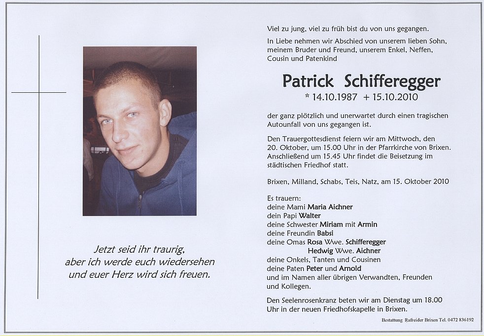 20. Oktober, um 15.00 Uhr in der Pfarrkirche von Brixen. Anschließend um 15.45 Uhr findet die Beisetzung im städtischen Friedhof statt.