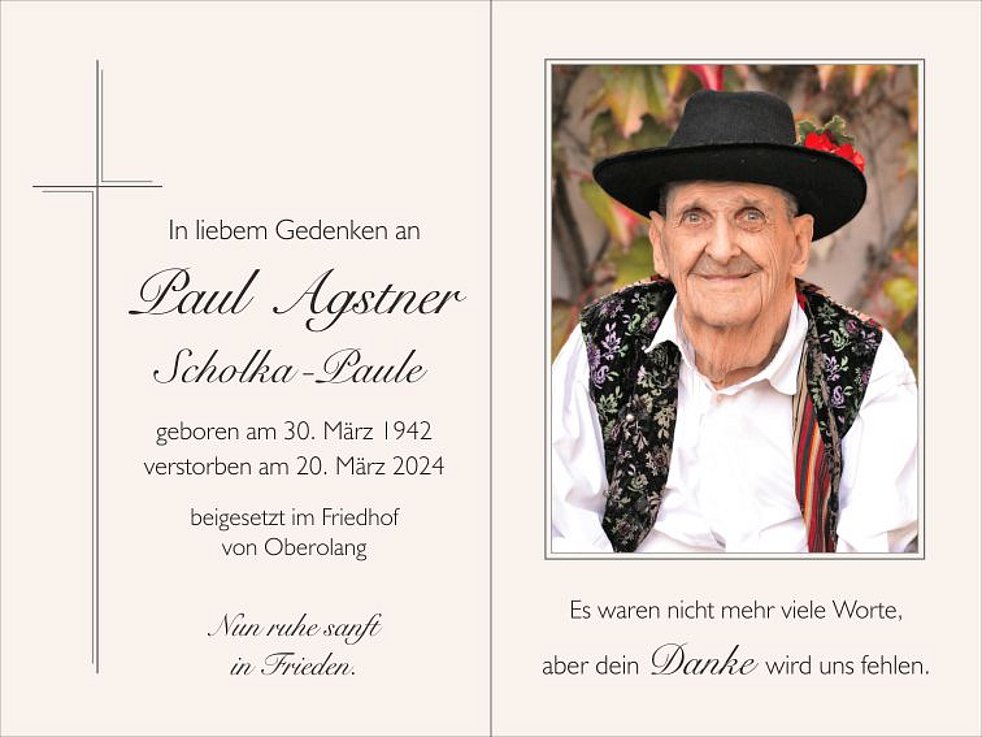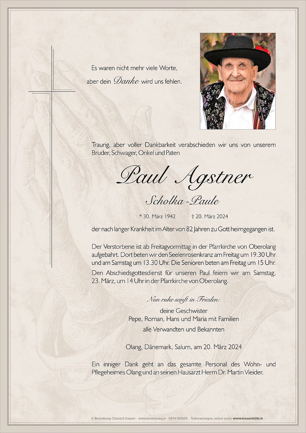 Den Abschiedsgottesdienst für unseren Paul feiern wir am Samstag, 23. März, um 14 Uhr in der Pfarrkirche von Oberolang.