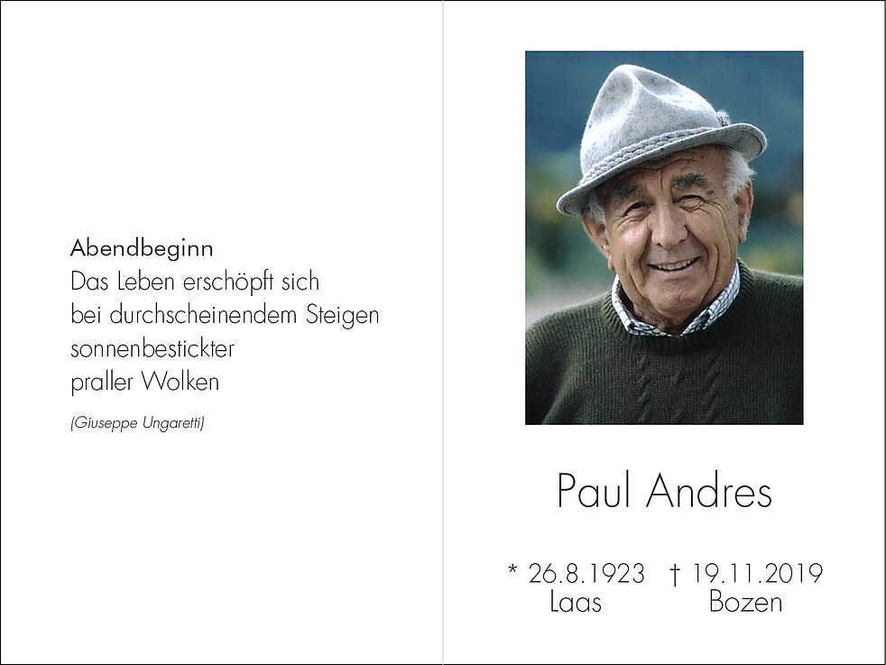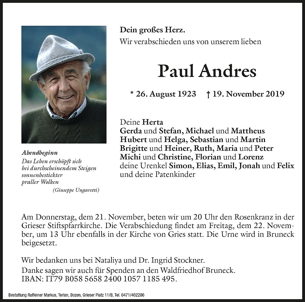 Am Donnerstag, dem 21. November, beten wir um 20 Uhr den Rosenkranz in der Grieser Stiftspfarrkirche. Die Verabschiedung findet am Freitag, dem 22. November, um 13 Uhr ebenfalls in der Kirche von Gries statt. Die Urne wird in Bruneck beigesetzt.
