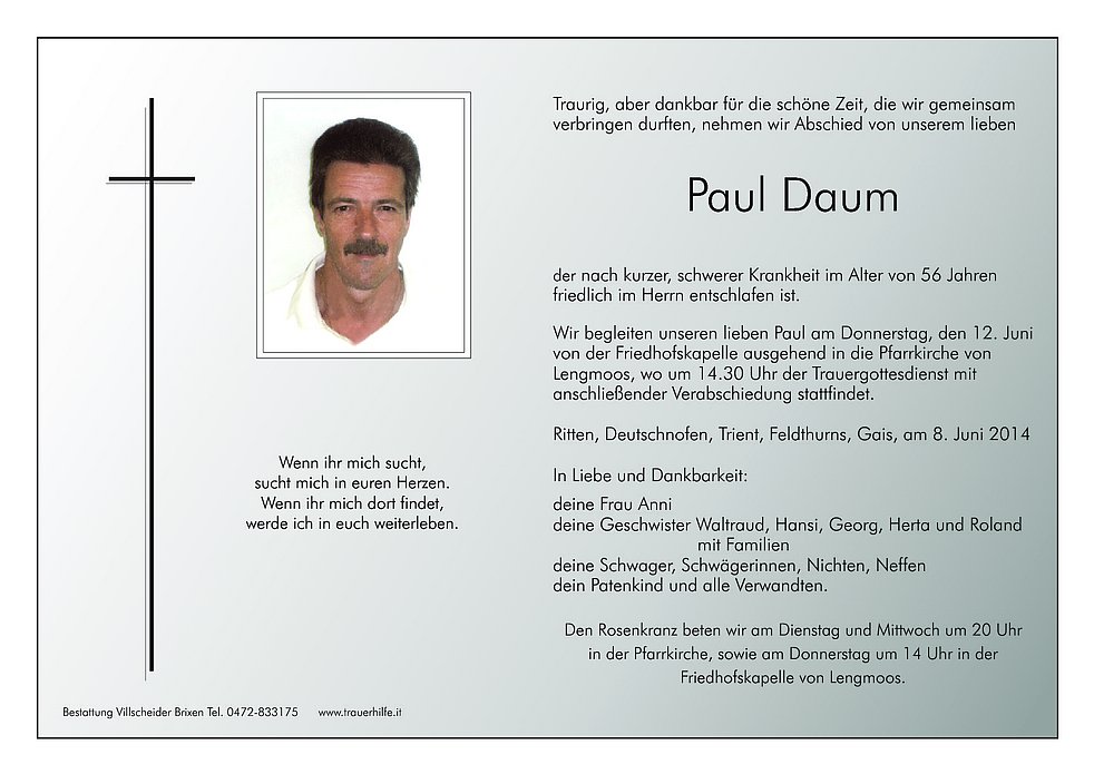 Wir begleiten unseren lieben Paul am Donnerstag, den 12. Juni von der Friedhofskapelle ausgehend in die Pfarrkirche von Lengmoos, wo um 14.30 Uhr der Trauergottesdienst mit anschließender Verabschiedung stattfindet.