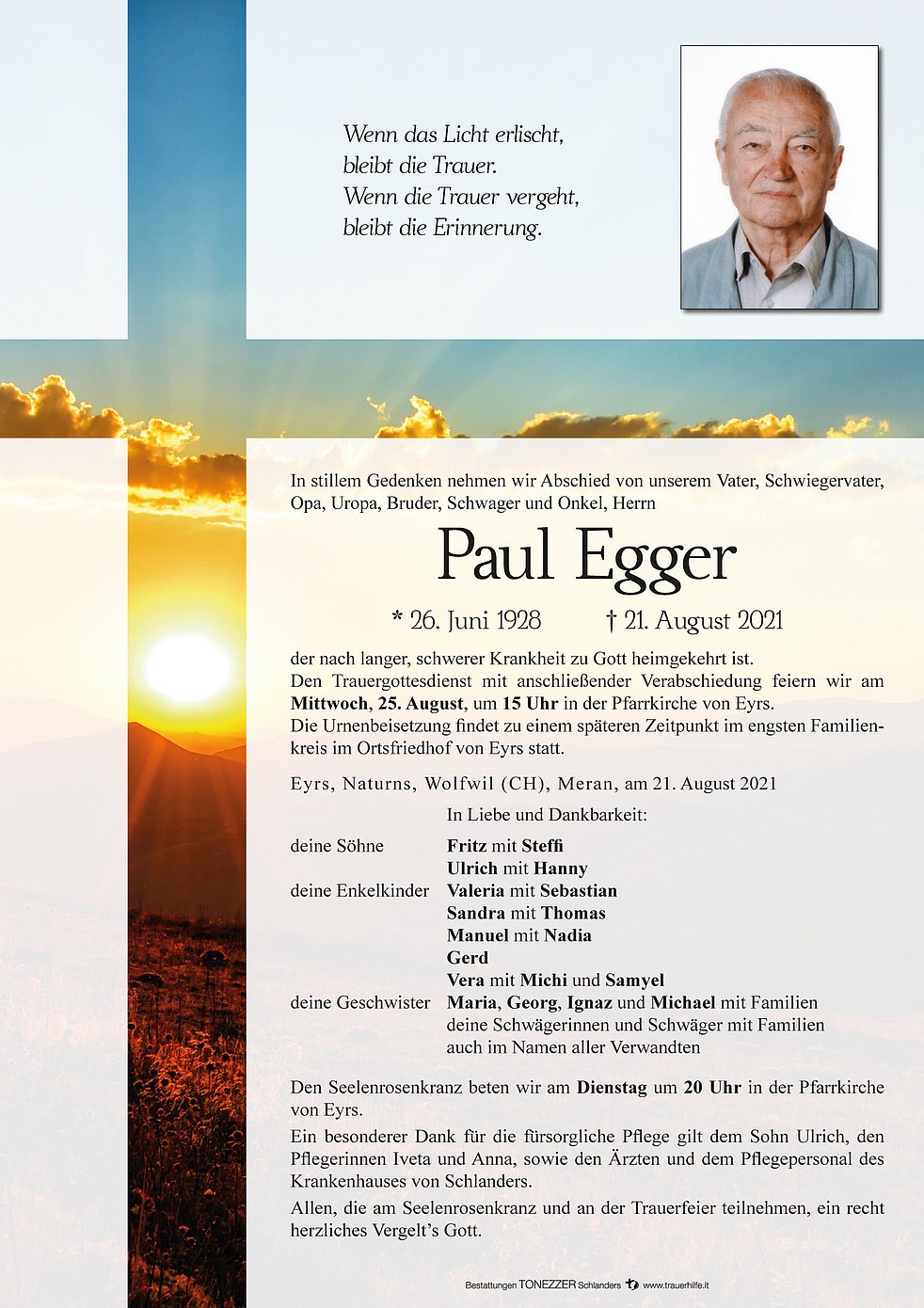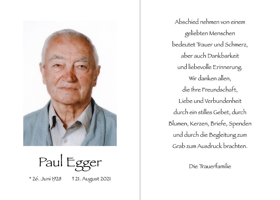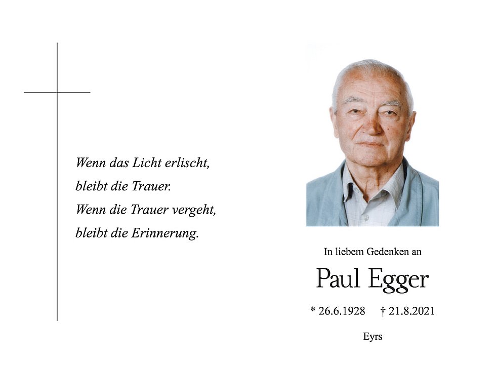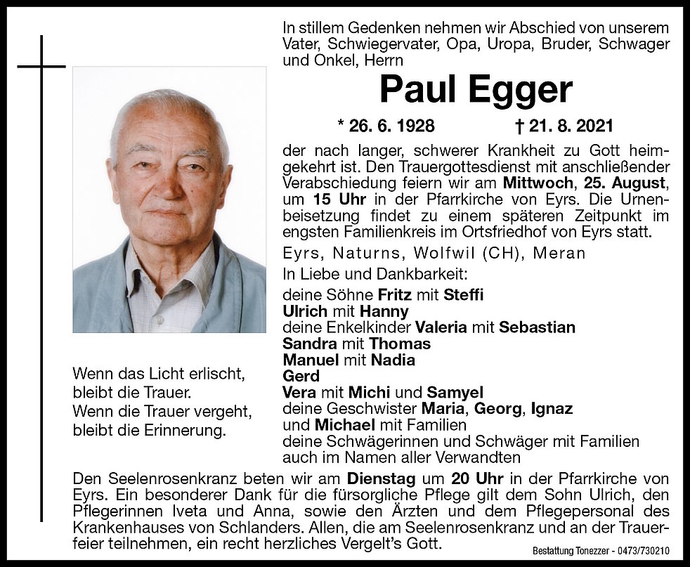 Den Trauergottesdienst mit anschließender Verabschiedung feiern wir am Mittwoch, 25. August, um 15 Uhr in der Pfarrkirche von Eyrs.