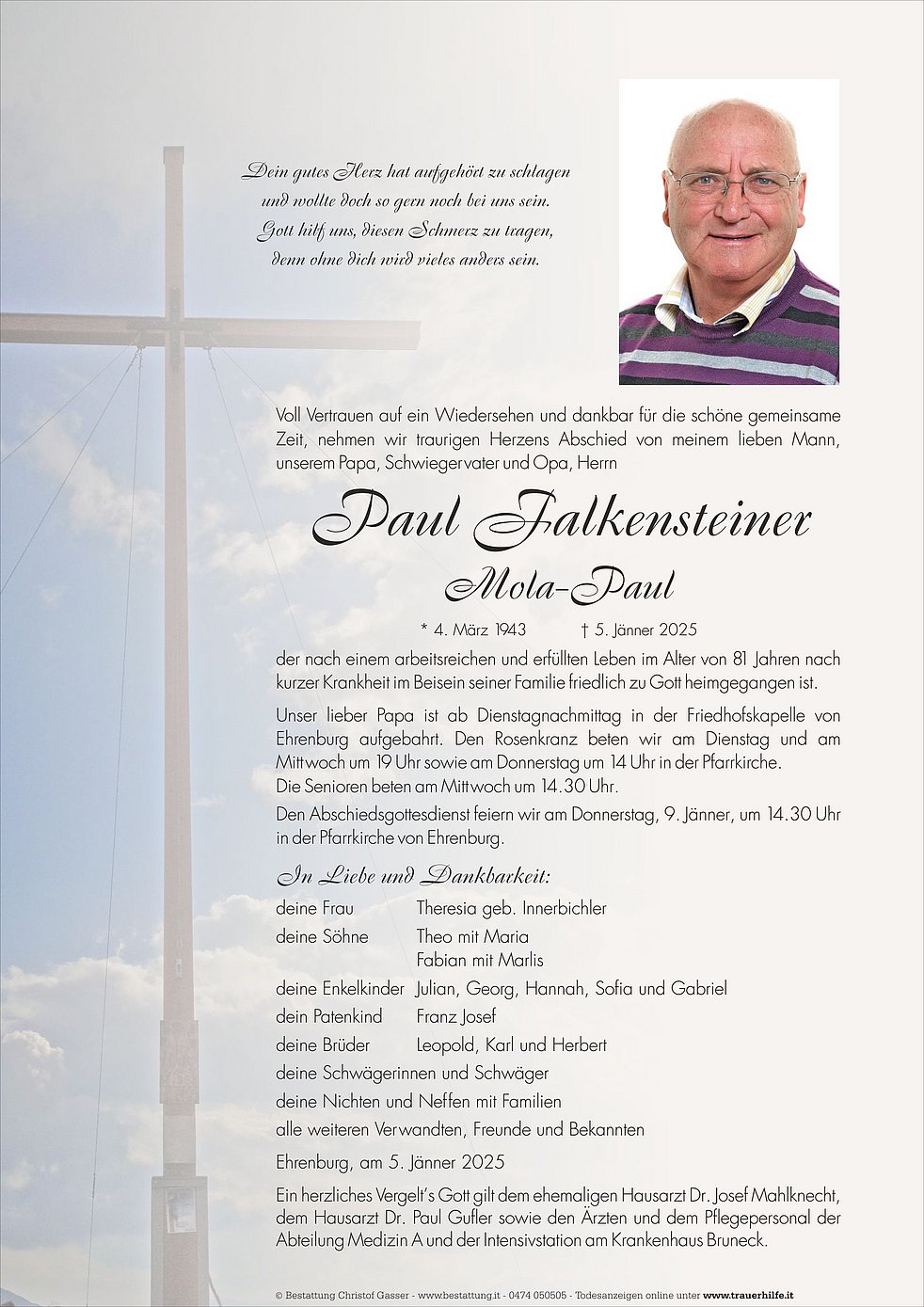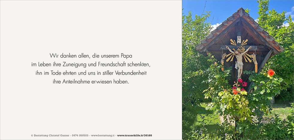 Ein herzliches Vergelt’s Gott gilt dem ehemaligen Hausarzt Dr. Josef Mahlknecht, dem Hausarzt Dr. Paul Gufler sowie den Ärzten und dem Pflegepersonal der Abteilung Medizin A und der Intensivstation am Krankenhaus Bruneck.