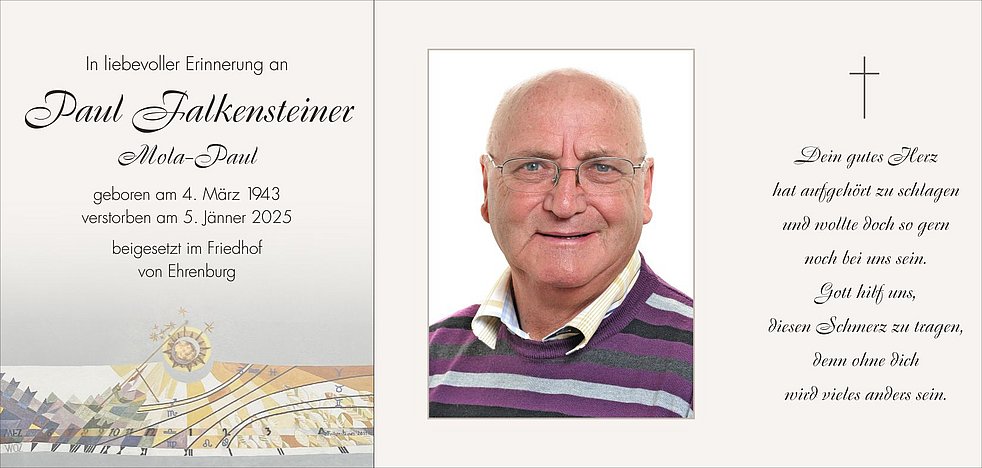 Unser lieber Papa ist ab Dienstagnachmittag in der Friedhofskapelle von Ehrenburg aufgebahrt. Den Rosenkranz beten wir am Dienstag und am Mittwoch um 19 Uhr sowie am Donnerstag um 14 Uhr in der Pfarrkirche. Die Senioren beten am Mittwoch um 14.30 Uhr.