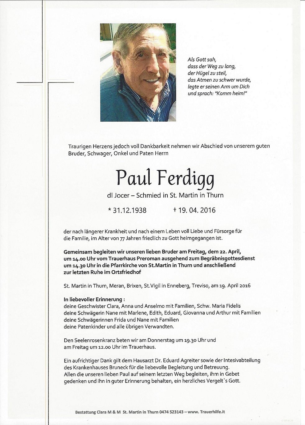 um 14.00 Uhr vom Trauerhaus Preroman ausgehend zum Begräbnisgottesdienst