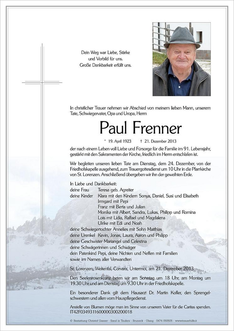 Anstelle von Blumen möge man im Sinne von unserem Vater für die Caritas spenden. IT42F0349311600000300200018