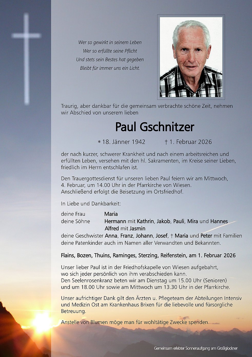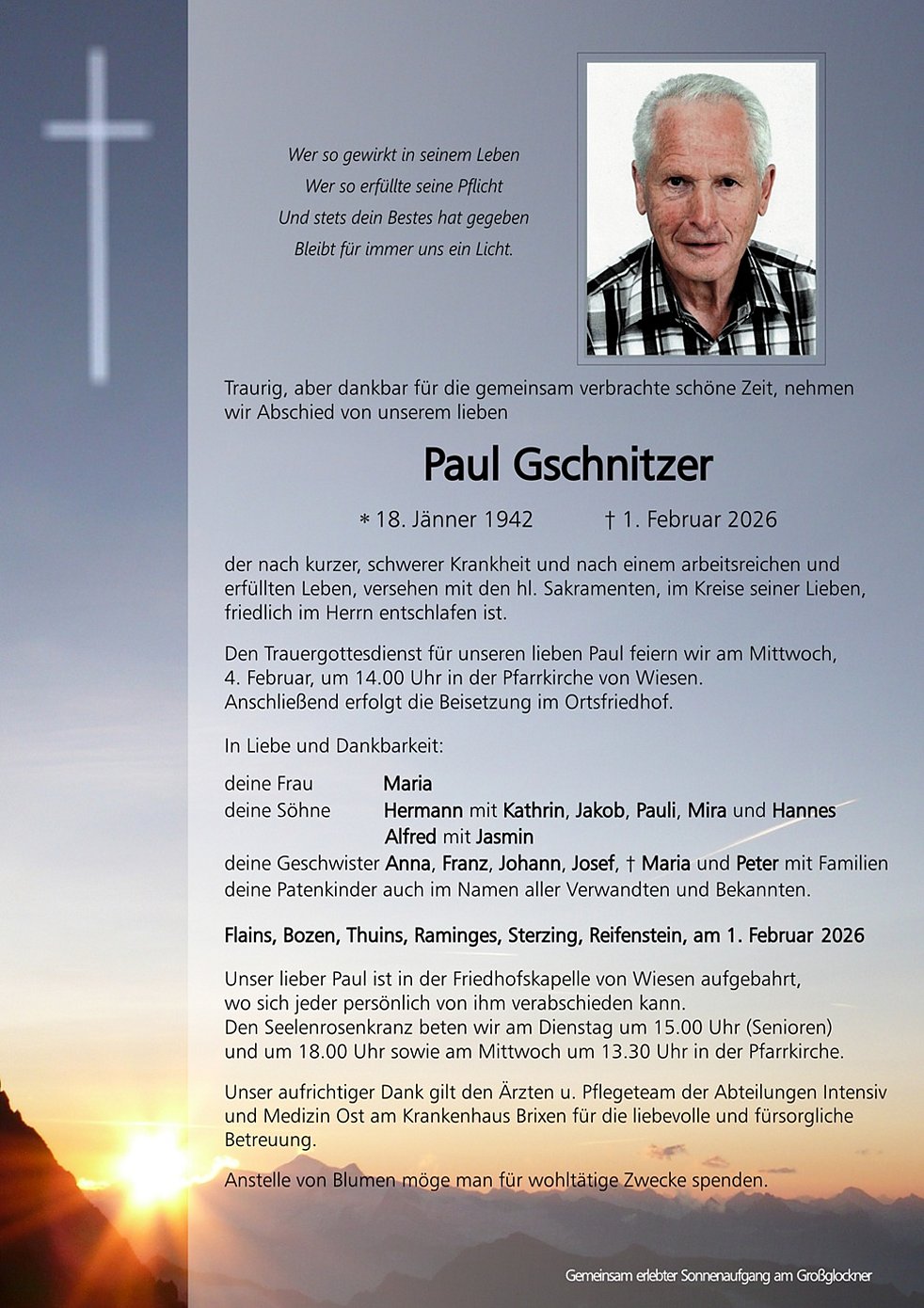 Den Trauergottesdienst für unseren lieben Paul feiern wir am Mittwoch, 4. Februar, um 14.00 Uhr in der Pfarrkirche von Wiesen. Anschließend erfolgt die Beisetzung im Ortsfriedhof.