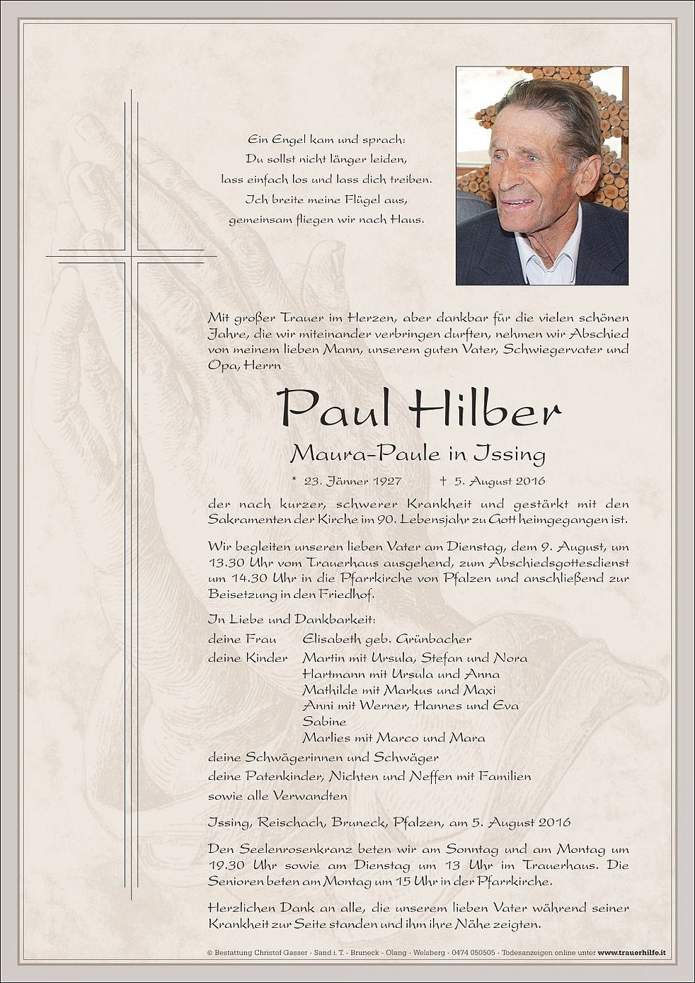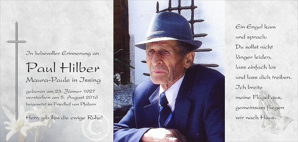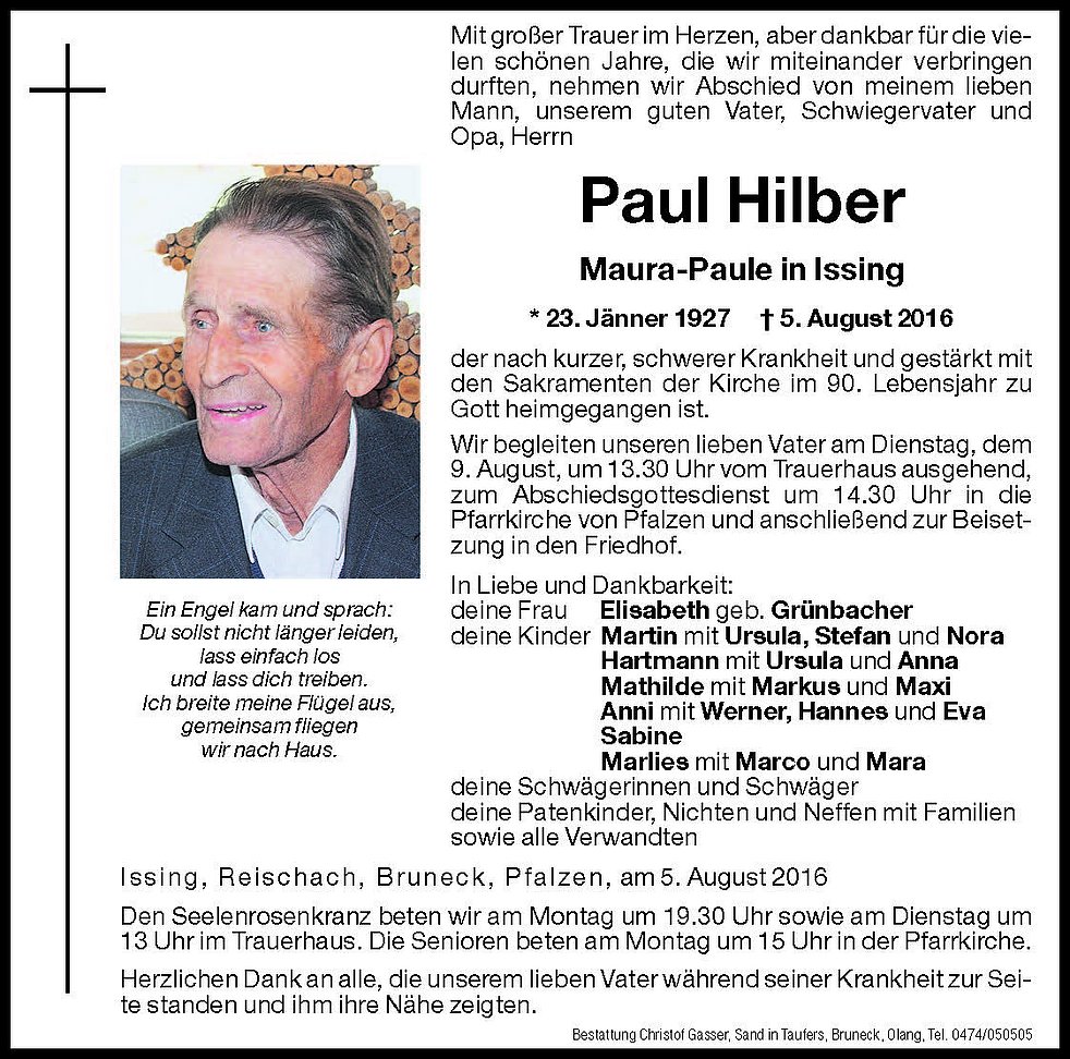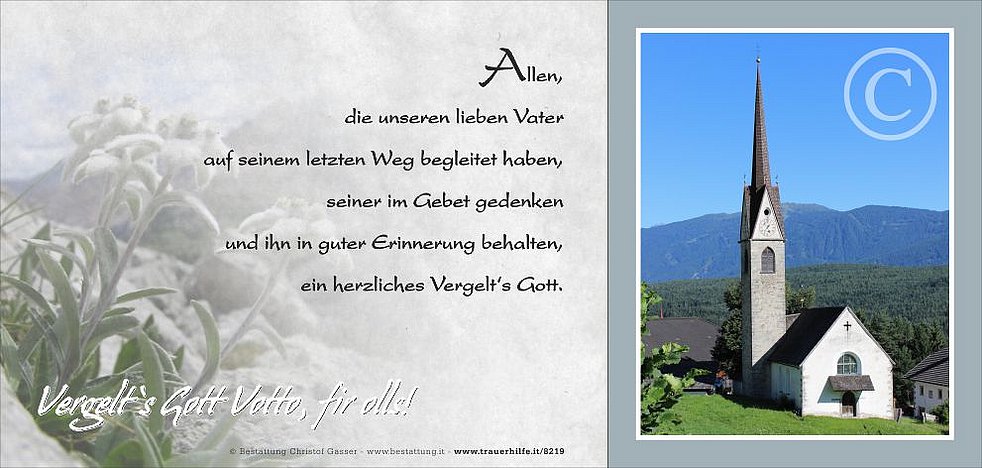 Wir begleiten unseren lieben Vater am Dienstag, dem 9. August, um 13.30 Uhr vom Trauerhaus ausgehend, zum Abschiedsgottesdienst um 14.30 Uhr in die Pfarrkirche von Pfalzen und anschließend zur Beisetzung in den Friedhof.