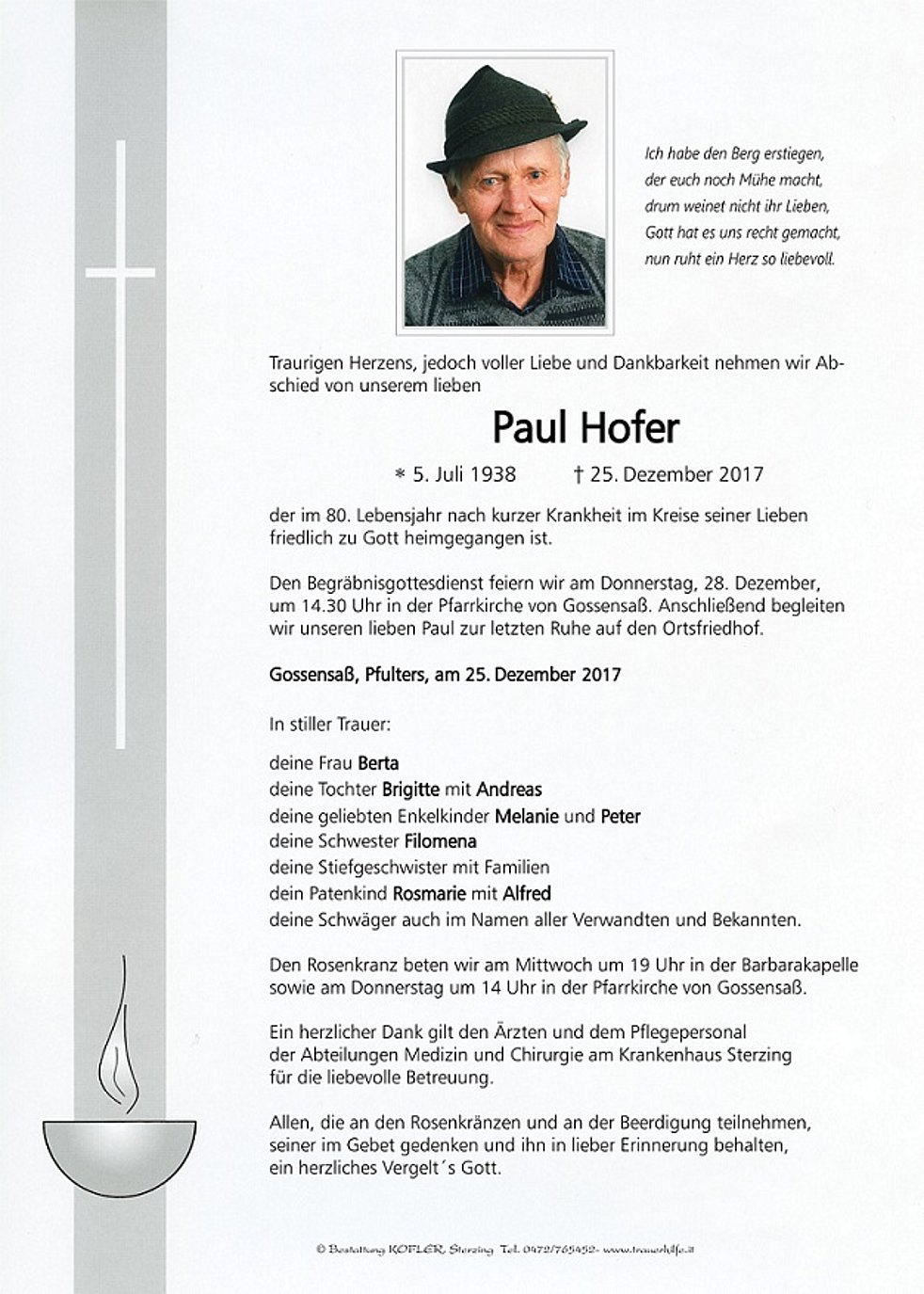 Den Begräbnisgottesdienst feiern wir am Donnerstag, 28. Dezember, um 14.30 Uhr in der Pfarrkirche von Gossensaß. Anschließend begleiten wir unseren lieben Paul zur letzten Ruhe auf den Ortsfriedhof.