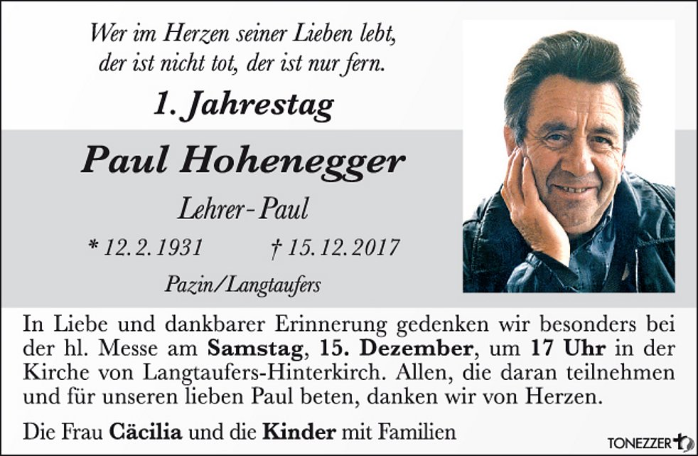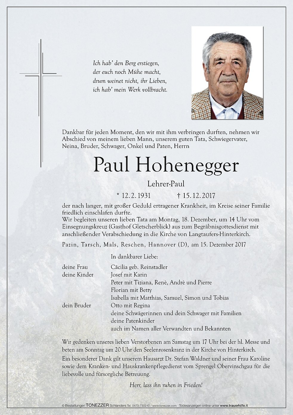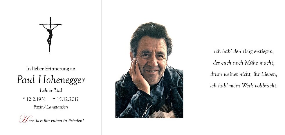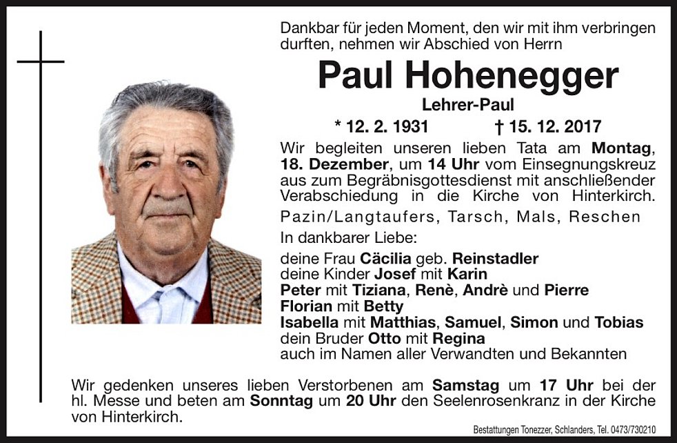 Wir begleiten unseren lieben Tata am Montag, 18. Dezember, um 14 Uhr vom Einsegnungskreuz (Gasthof Gletscherblick) aus zum Begräbnisgottesdienst mit anschließender Verabschiedung in die Kirche von Langtaufers-Hinterkirch.