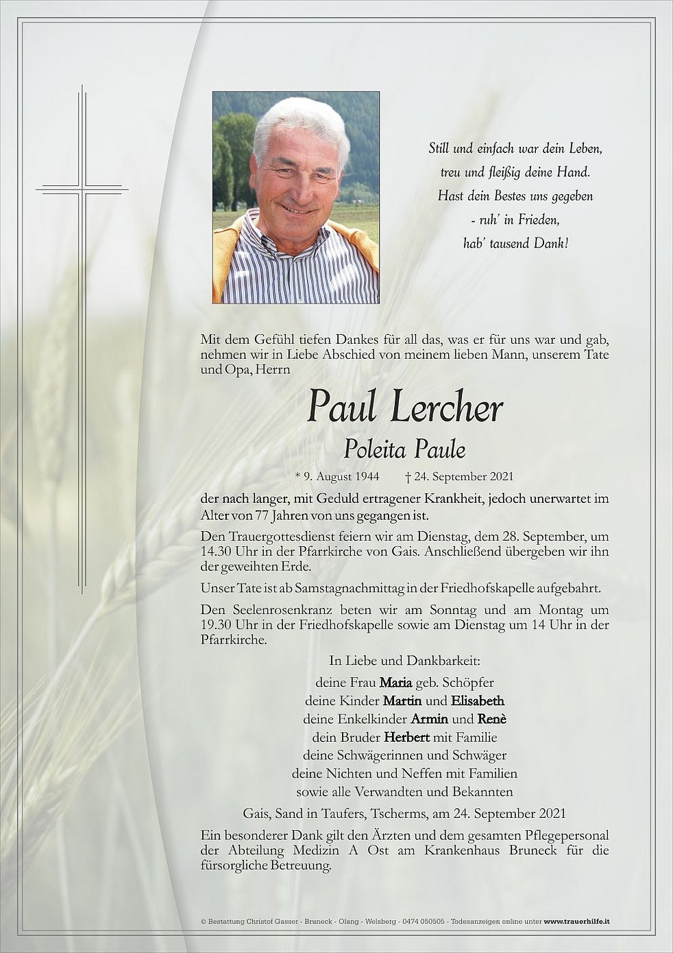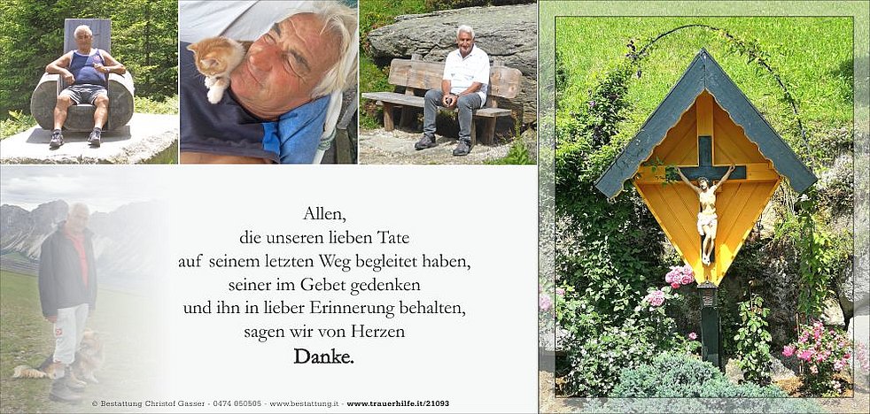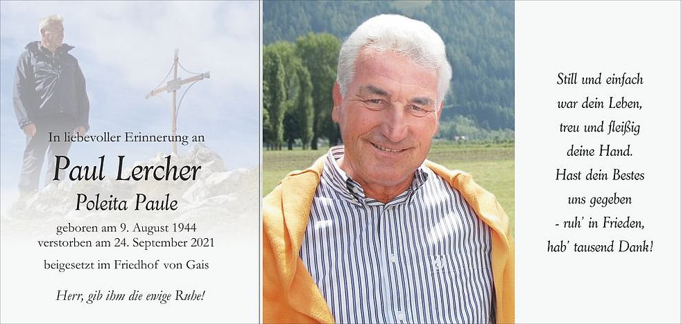 Den Trauergottesdienst feiern wir am Dienstag, dem 28. September, um 14.30 Uhr in der Pfarrkirche von Gais. Anschließend übergeben wir ihn der geweihten Erde.