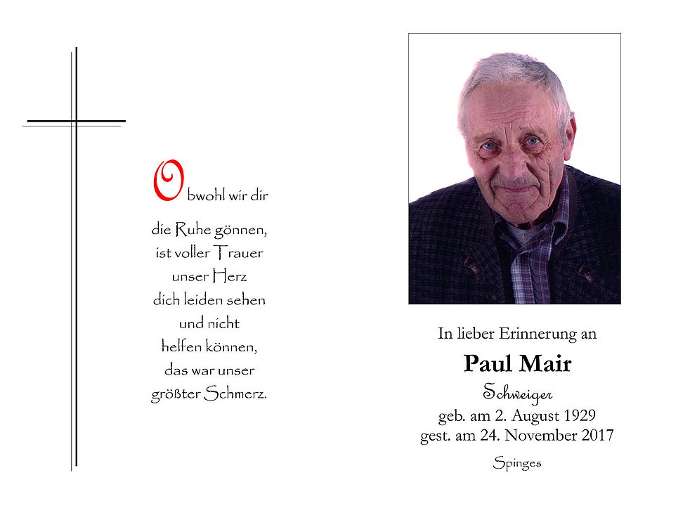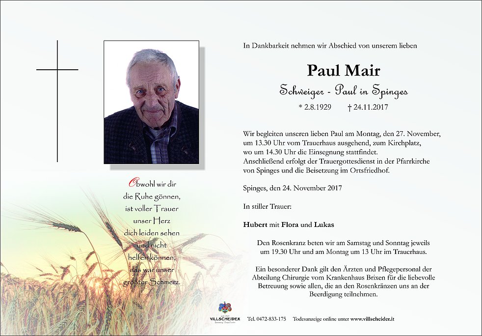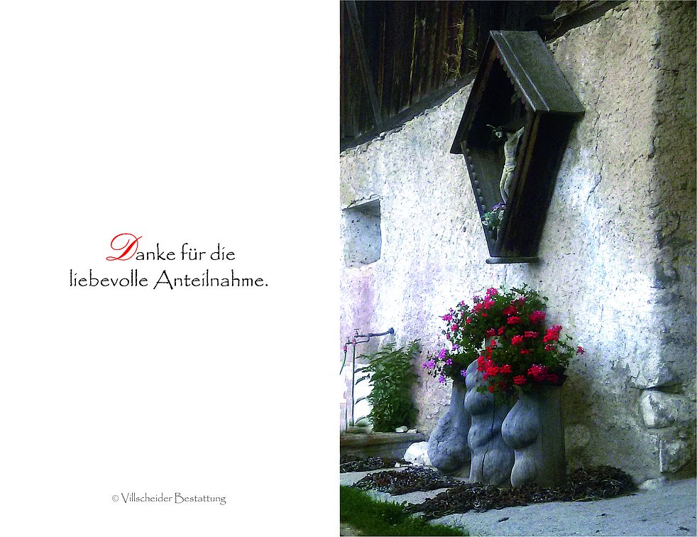 Ein besonderer Dank gilt den Ärzten und Pflegepersonal der Abteilung Chirurgie vom Krankenhaus Brixen für die liebevolle Betreuung sowie allen, die an den Rosenkränzen und an der Beerdigung teilnehmen.