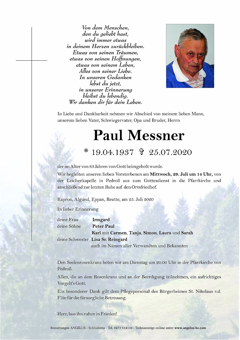Wir begleiten unseren lieben Verstorbenen am Mittwoch, 29. Juli um 14 Uhr, von der Leichenkapelle in Pedroß aus zum Gottesdienst in die Pfarrkirche und anschließend zur letzten Ruhe auf den Ortsfriedhof.