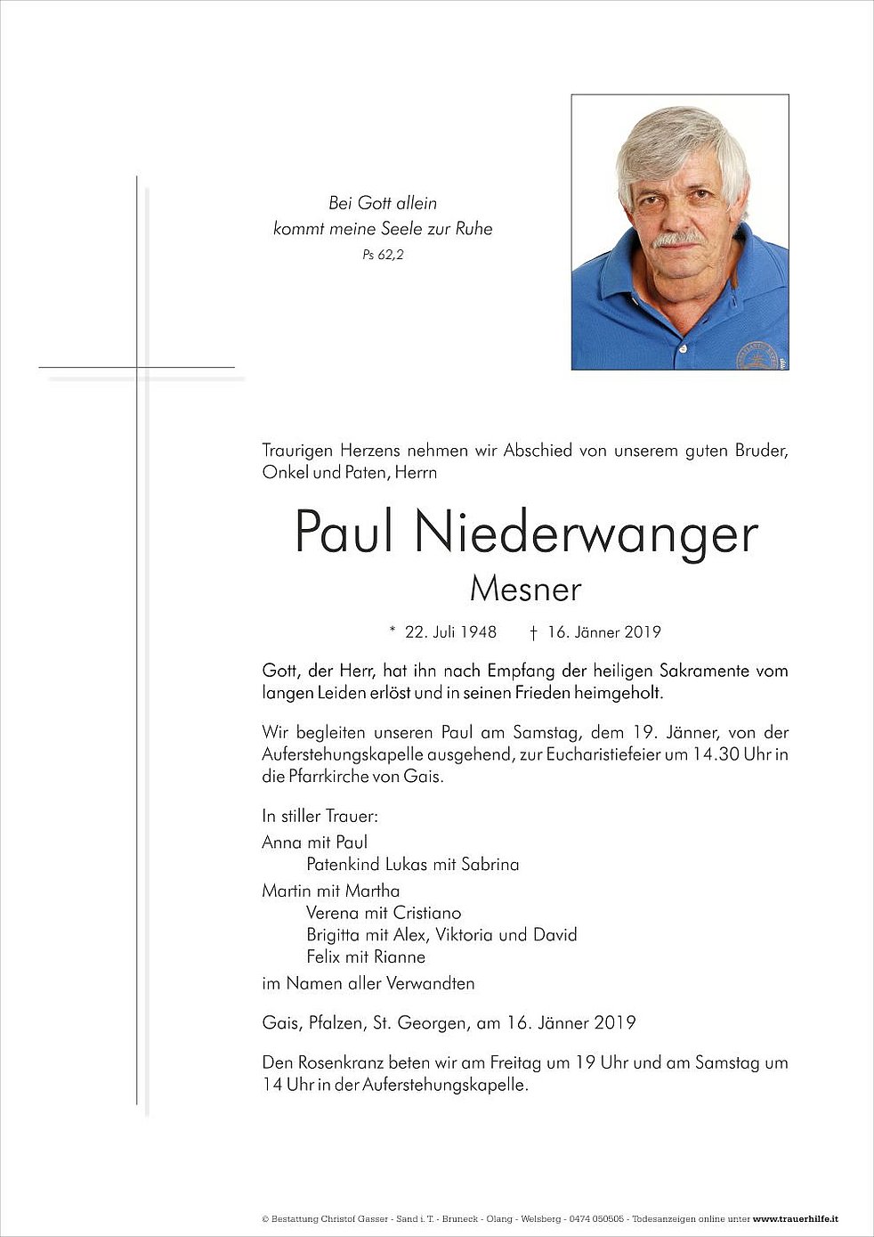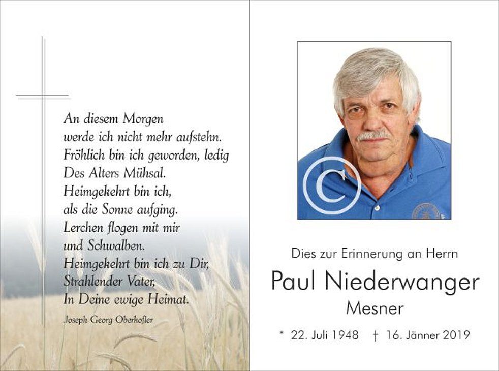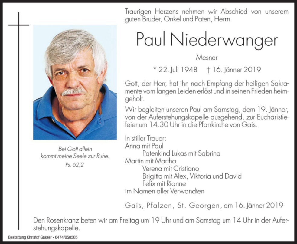 Wir begleiten unseren Paul am Samstag, dem 19. Jänner, von der Auferstehungskapelle ausgehend, zur Eucharistiefeier um 14.30 Uhr in die Pfarrkirche von Gais.
