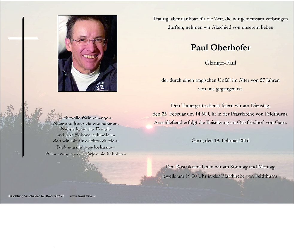 den 23. Februar um 14.30 Uhr in der Pfarrkirche von Feldthurns. Anschließend erfolgt die Beisetzung im Ortsfriedhof von Garn.