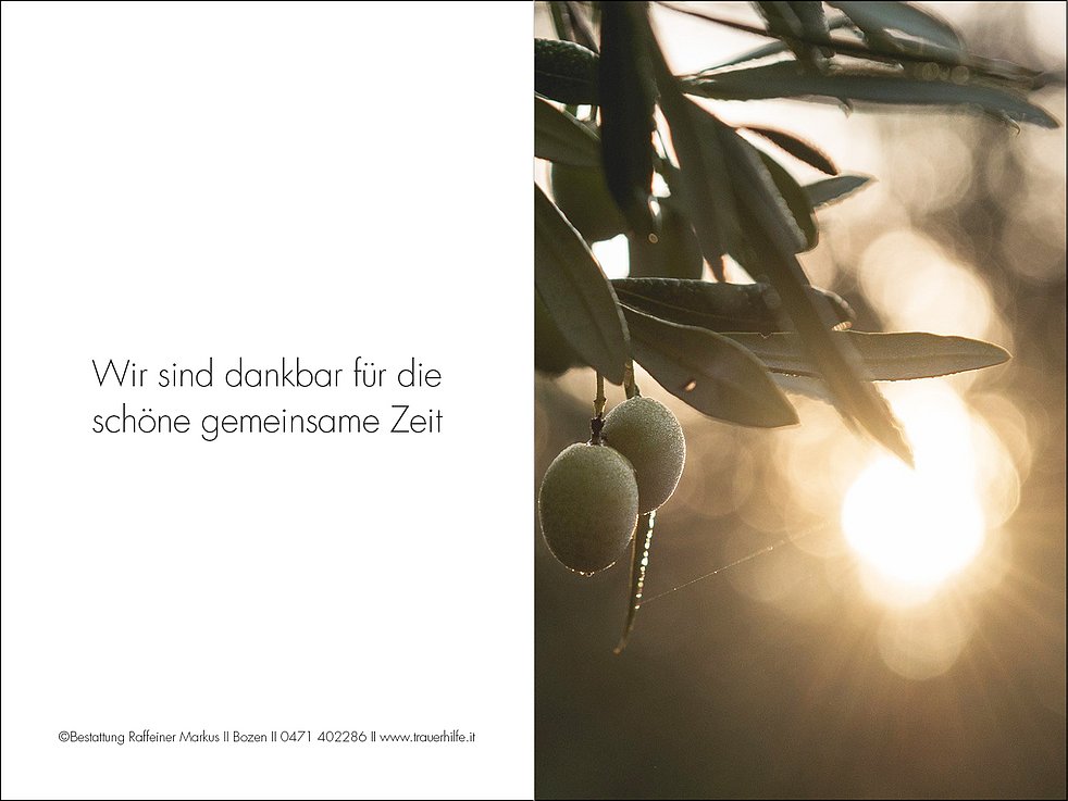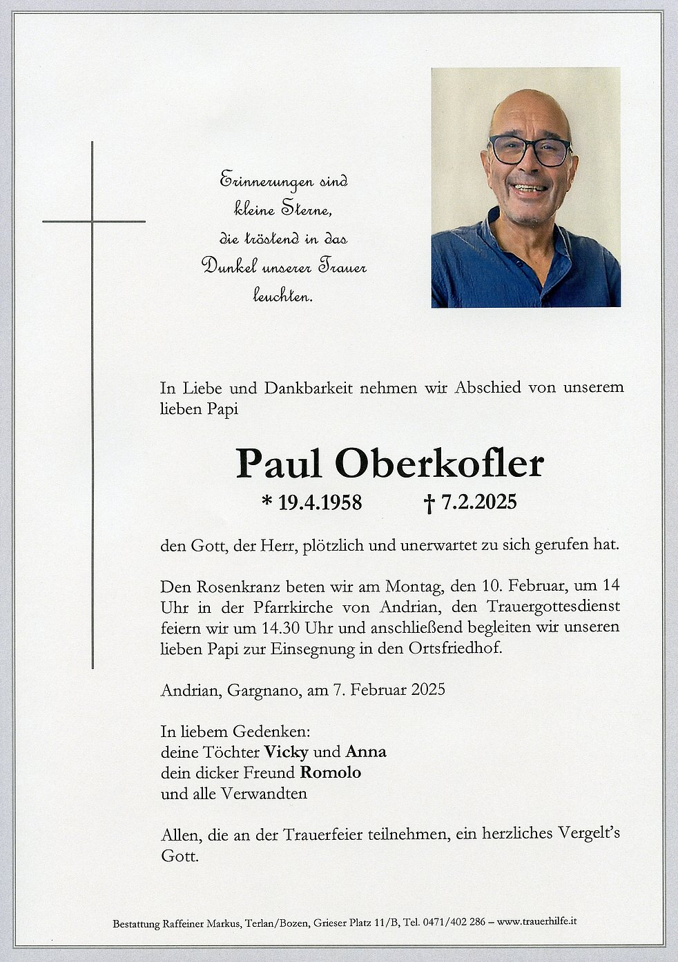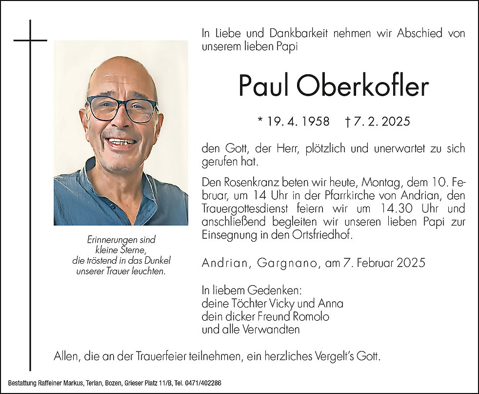 Den Rosenkranz beten wir am Montag, den 10. Februar, um 14 Uhr in der Pfarrkirche von Andrian, den Trauergottesdienst feiern wir um 14.30 Uhr und anschließend begleiten wir unseren lieben Papi zur Einsegnung in den Ortsfriedhof.