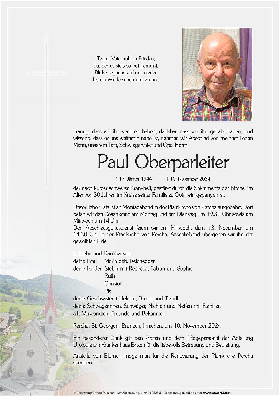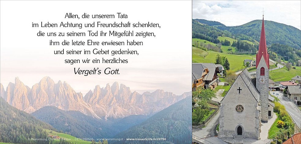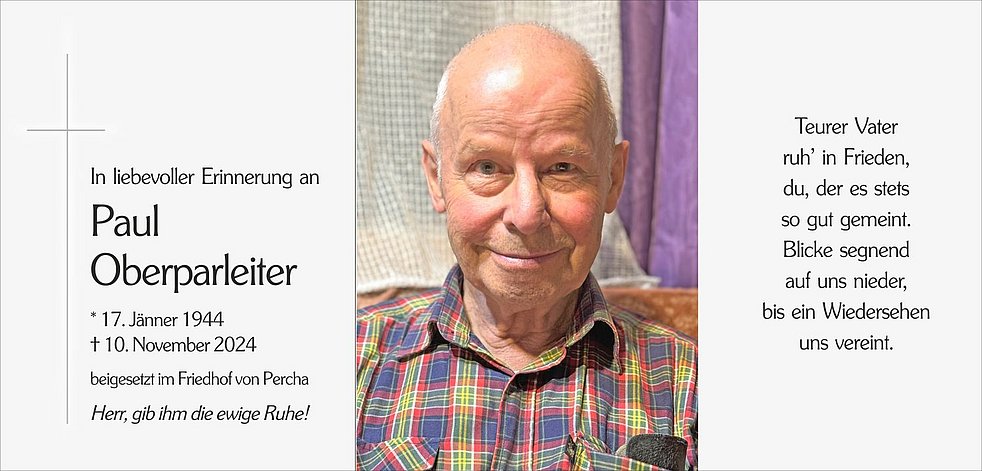 Unser lieber Tata ist ab Montagabend in der Pfarrkirche von Percha aufgebahrt. Dort beten wir den Rosenkranz am Montag und am Dienstag um 19.30 Uhr sowie am Mittwoch um 14 Uhr.
