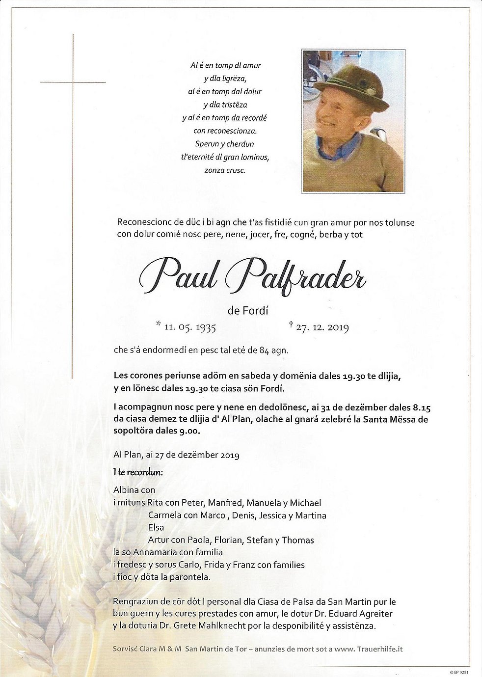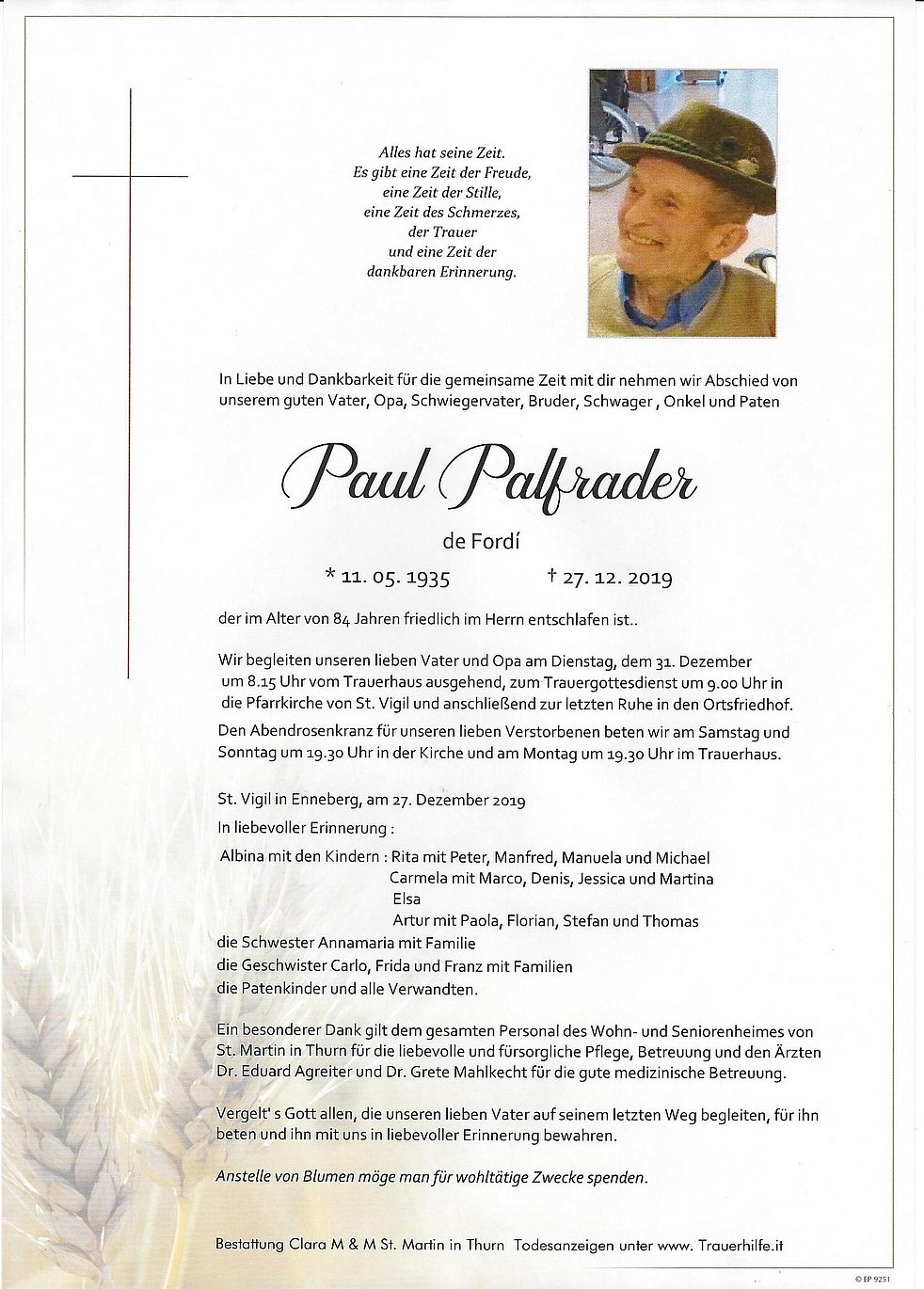 Wir begleiten unseren lieben Vater und Opa am Dienstag, dem 31. Dezember um 8.15 Uhr vom Trauerhaus ausgehend, zum Trauergottesdienst um 9.00 Uhr in die Pfarrkirche von St. Vigil und anschließend zur letzten Ruhe in den Ortsfriedhof.