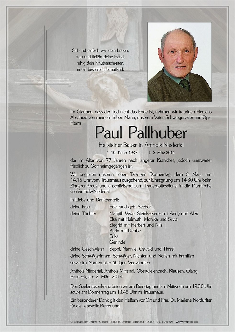 14.15 Uhr vom Trauerhaus ausgehend, zur Einsegnung um 14.30 Uhr beim Ziggerer-Kreuz und anschließend zum Trauergottesdienst in die Pfarrkirche von Antholz-Niedertal.
