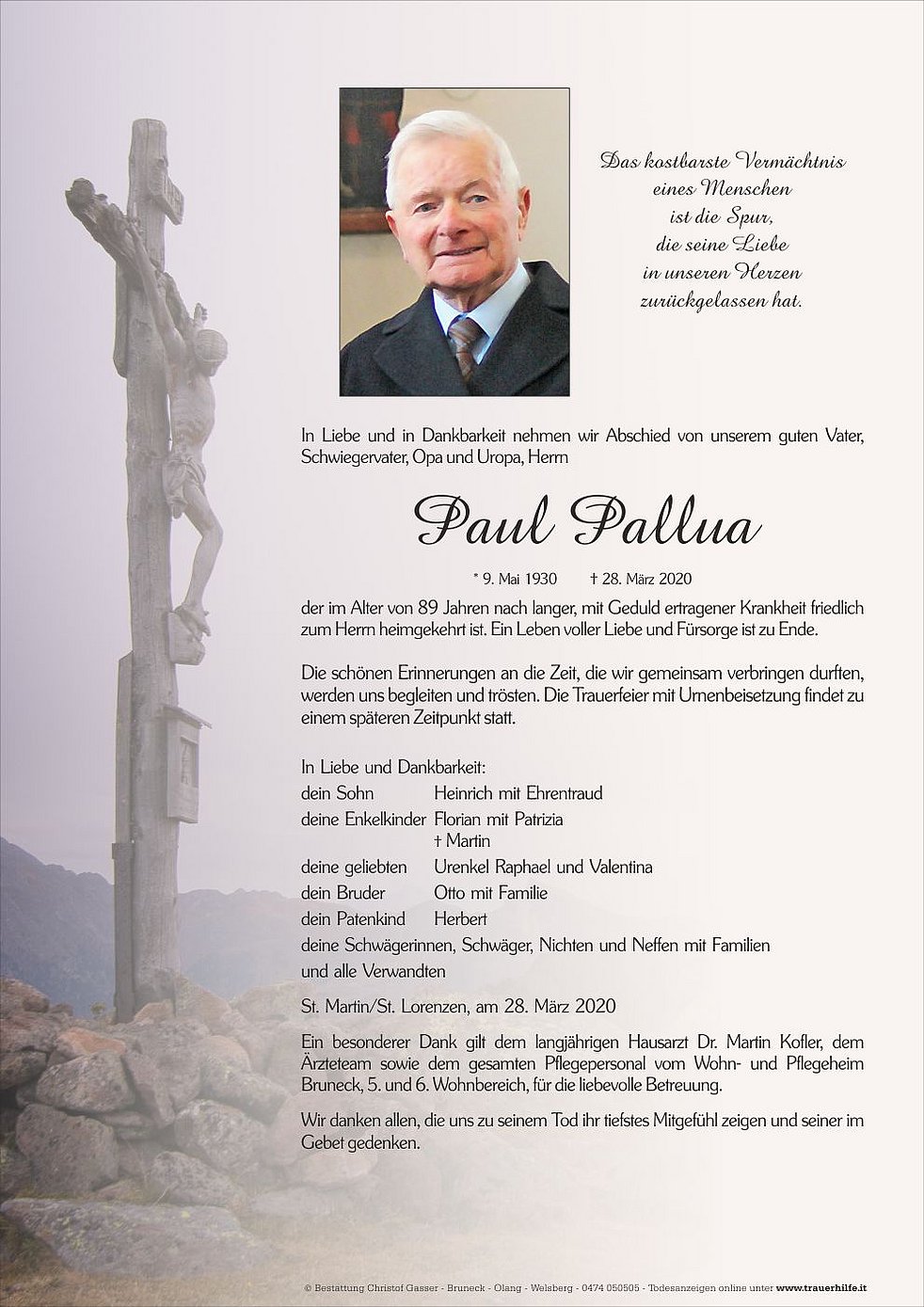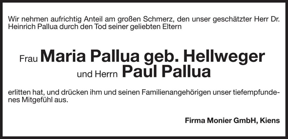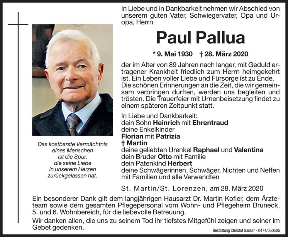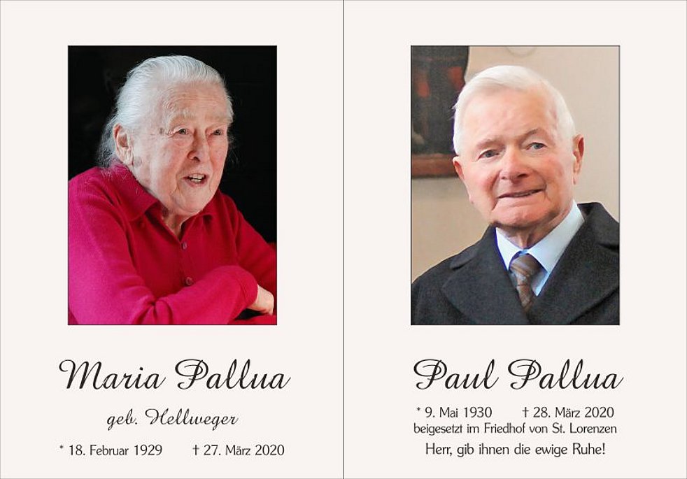 Ein besonderer Dank gilt dem langjährigen Hausarzt Dr. Martin Kofler, dem Ärzteteam sowie dem gesamten Pflegepersonal vom Wohn- und Pflegeheim Bruneck, 5. und 6. Wohnbereich, für die liebevolle Betreuung.