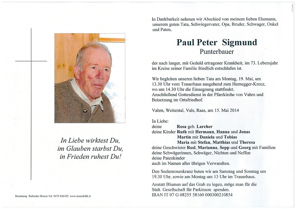 Anstatt Blumen auf das Grab zu legen, möge man für die Südt. Gesellschaft für Parkinson spenden. IBAN IT 07 G 08255 58160 000300210854