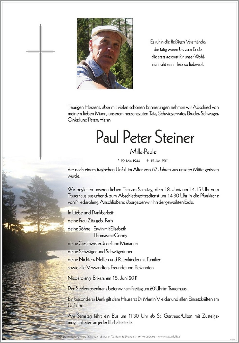 Wir begleiten unseren lieben Tata am Samstag, dem 18. Juni, um 14.15 Uhr vom Trauerhaus ausgehend, zum Abschiedsgottesdienst um 14.30 Uhr in die Pfarrkirche von Niederolang. Anschließend übergeben wir ihn der geweihten Erde.
