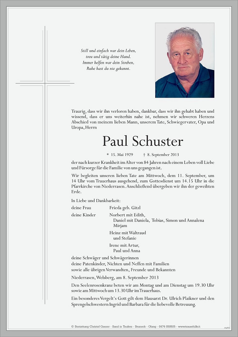 14 Uhr vom Trauerhaus ausgehend, zum Gottesdienst um 14.15 Uhr in die Pfarrkirche von Niederrasen. Anschließend übergeben wir ihn der geweihten Erde.