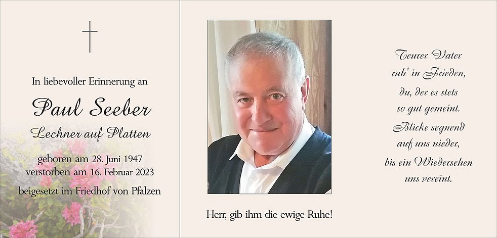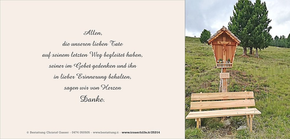 Ein herzliches Vergelt’s Gott gilt der Hausärztin Frau Dr. Berta Marcher, dem Hauskrankenpflegedienst sowie den behandelnden Ärzten und dem Pflegepersonal am Krankenhaus Bruneck für die fürsorgliche Betreuung.