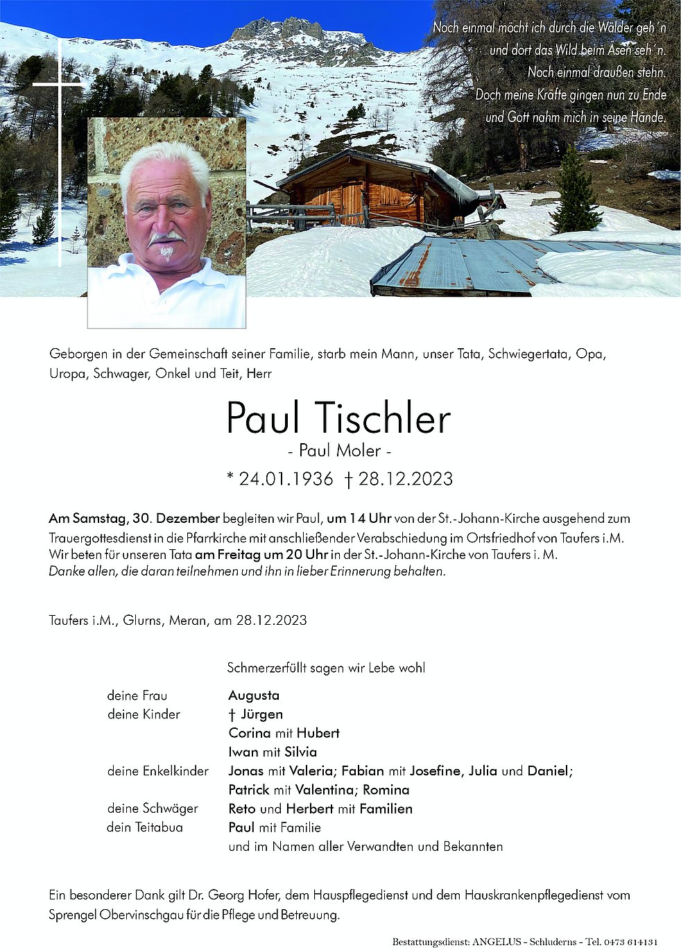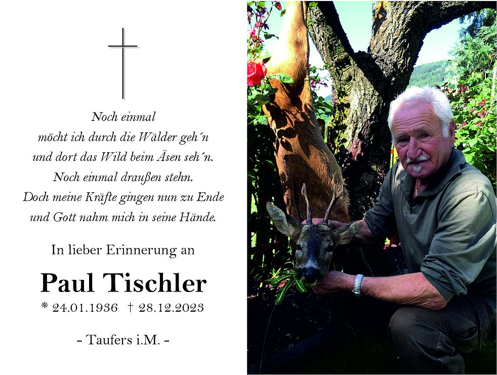 Trauerfeier: 30.12. - 14:00 Uhr Pfarrkirche von Taufers im Münstertal