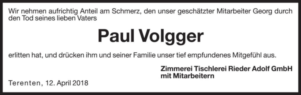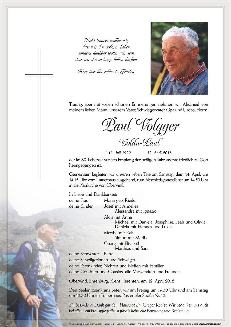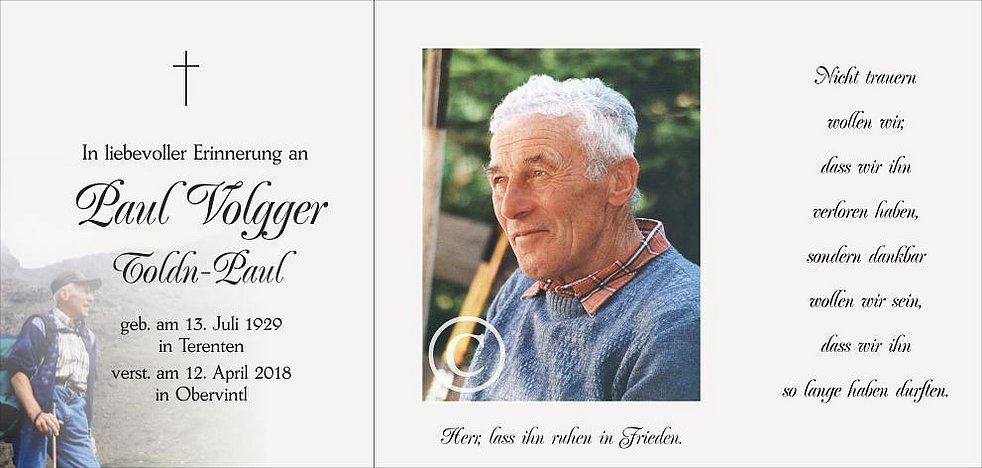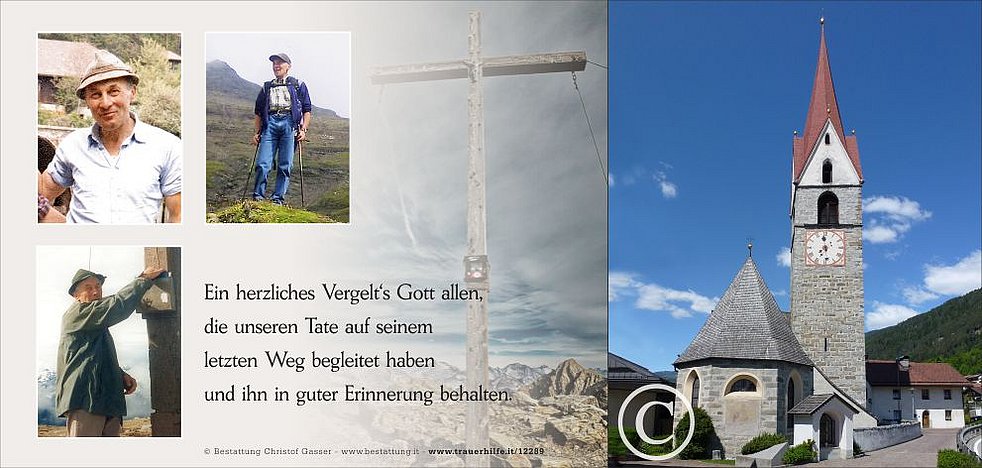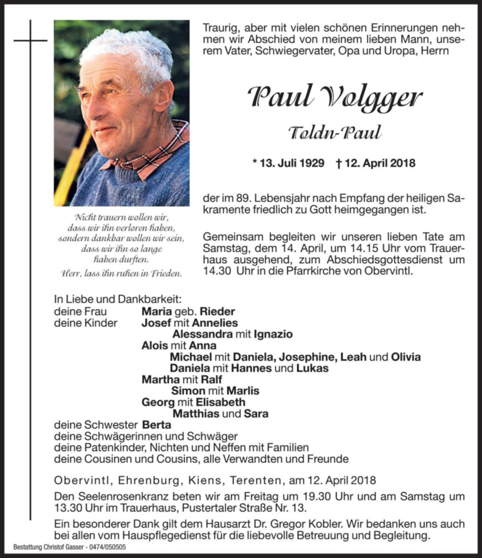 Gemeinsam begleiten wir unseren lieben Tate am Samstag, dem 14. April, um 14.15 Uhr vom Trauerhaus ausgehend, zum Abschiedsgottesdienst um 14.30 Uhr in die Pfarrkirche von Obervintl.
