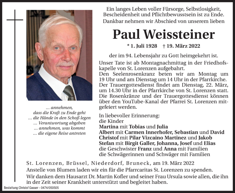 Der Trauergottesdienst findet am Dienstag, 22. März, um 14.30 Uhr in der Pfarrkirche von St. Lorenzen statt. Die Rosenkränze und der Trauergottesdienst können über den YouTube-Kanal der Pfarrei St. Lorenzen mitgefeiert werden.